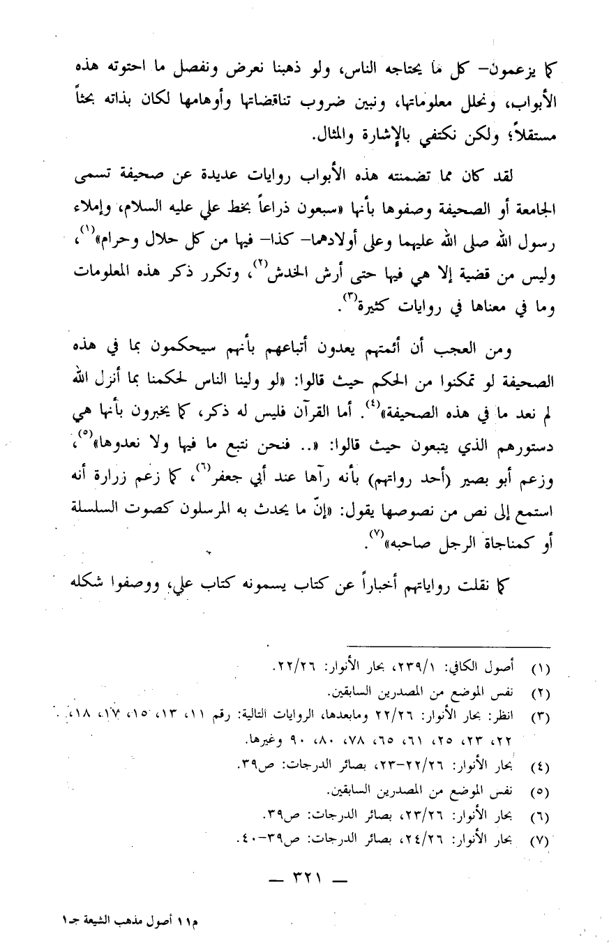 لقد كان مما تضمنته هذه الأبواب روايات عديدة عن صحيفة تسمى الجامعة أو الصحيفة، وصفوها بأنها "سبعون ذراعاً بخط علي عليه السلام، وإملاء رسول الله صلى الله عليهما وعلى أولادهما - كذا - فيها من كل حلال وحرام" (¬1) ، وليس من قضية إلا هي فيها حتى أرش الخدش (¬2) ، وتكرر ذكر هذه المعلومات وما في معناها في روايات كثيرة (¬3) .
