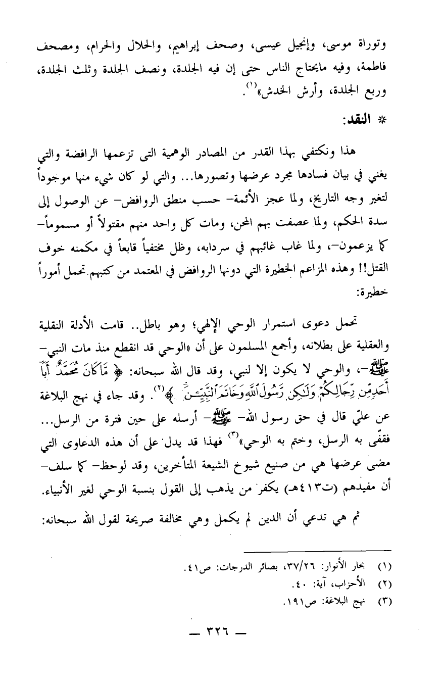 تحمل دعوى استمرار الوحي الإلهي، وهو باطل.. قامت الأدلة النقلية والعقلية على بطلانه، وأجمع المسلمون على أن "الوحي قد انقطع منذ مات النبي صلى الله عليه وسلم، والوحي لا يكون إلا لنبي، وقد قال الله سبحانه: {مَّا كَانَ مُحَمَّدٌ أَبَا أَحَدٍ مِّن رِّجَالِكُمْ وَلَكِن رَّسُولَ اللَّهِ وَخَاتَمَ النَّبِيِّينَ} (¬2) . وقد جاء في نهج البلاغة عن علي قال في حق رسول الله صلى الله عليه وسلم: "أرسله على حين فترة من الرسل.. فقفّى به الرسل، وختم به الوحي" (¬3) .