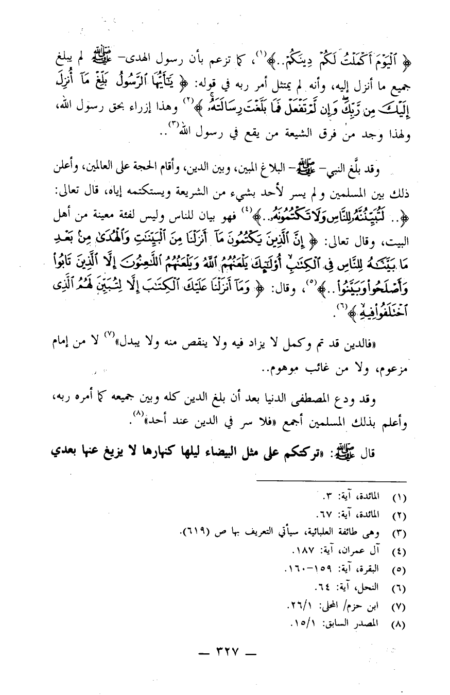 "فالدين قد تم وكمل لا يزاد فيه ولا ينقص منه ولا يبدل" (¬7) . لا من إمام مزعوم، ولا من غائب موهوم.