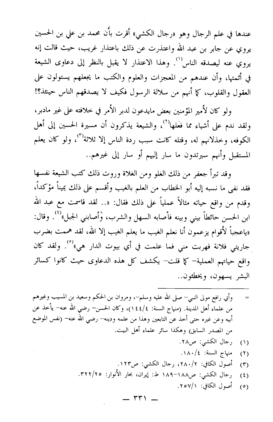 عندها في علم الرجال وهو "رجال الكشي" أقرت بأن محمد بن علي بن الحسين يروي عن جابر بن عبد الله، واعتذرت عن ذلك باعتذار غريب، حيث قالت: إنه يروي عنه ليصدقه الناس (¬1) . وهذا الاعتذار لا يقبل بالنظر إلى دعاوى الشيعة في أئمتها، وأن عندهم من المعجزات والعلوم والكتب ما يجعلهم يستولون على العقول والقلوب، كما أنهم من سلالة الرسول فكيف لا يصدقهم الناس حينئذ؟!