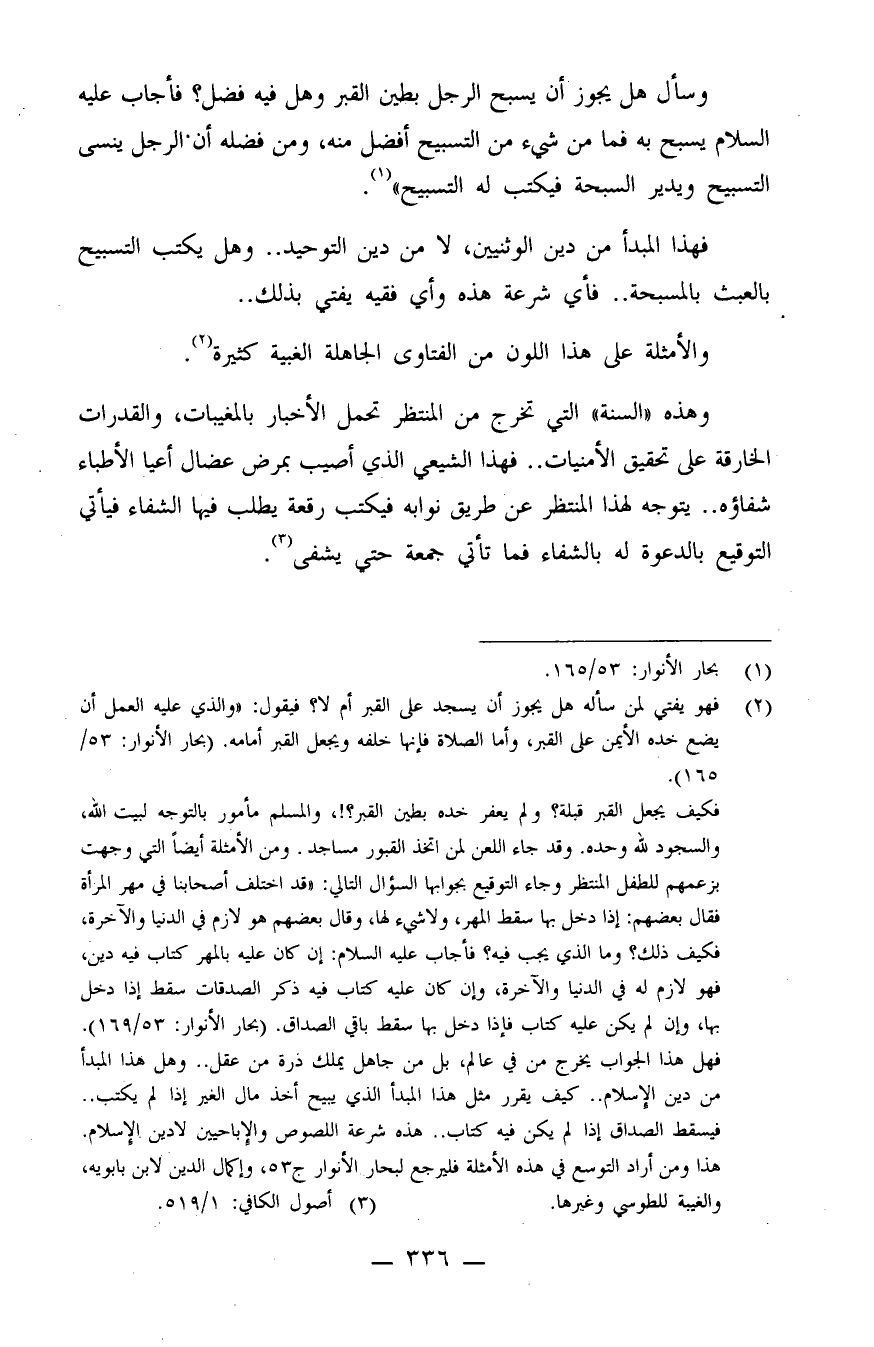 فهل هذا الجواب يخرج من فيّ عالم، بل من جاهل يملك ذرة من عقل؟ وهل هذا المبدأ من دين الإسلام؟ كيف يقرر مثل هذا المبدأ الذي يبيح أخذ مال الغير إذا لم يكتب.. فيسقط الصداق إذا لم يكن فيه كتاب.. هذه شرعة اللصوص والإباحيين لا دين الإسلام. هذا ومن أراد التوسع في هذه الأمثلة فليرجع لبحار الانوار ج، وإكمال الدين لابن بابويه، والغيبة للطوسي وغيرها