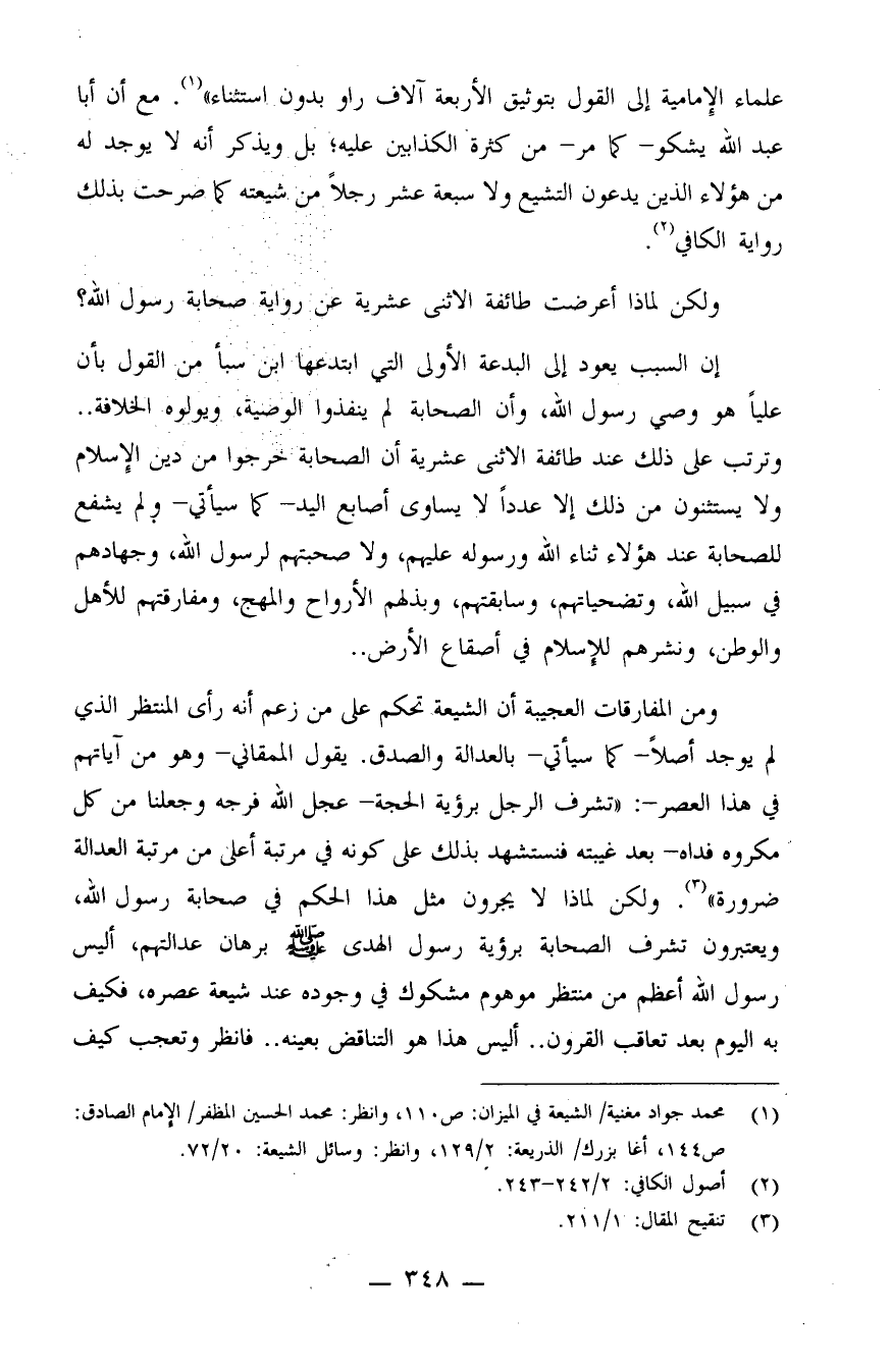 ولكن لماذا لا يجرون مثل هذا الحكم في صحابة رسول الله، ويعتبرون تشرف الصحابة برؤية رسول الهدى صلى الله عليه وسلم برهان عدالتهم، أليس رسول الله أعظم من منتظر موهوم مشكوك في وجوده عند شيعة عصره، فكيف به اليوم بعد تعاقب القرون.. أليس هذا هو التناقض بعينه؟! فانظر وتعجب كيف