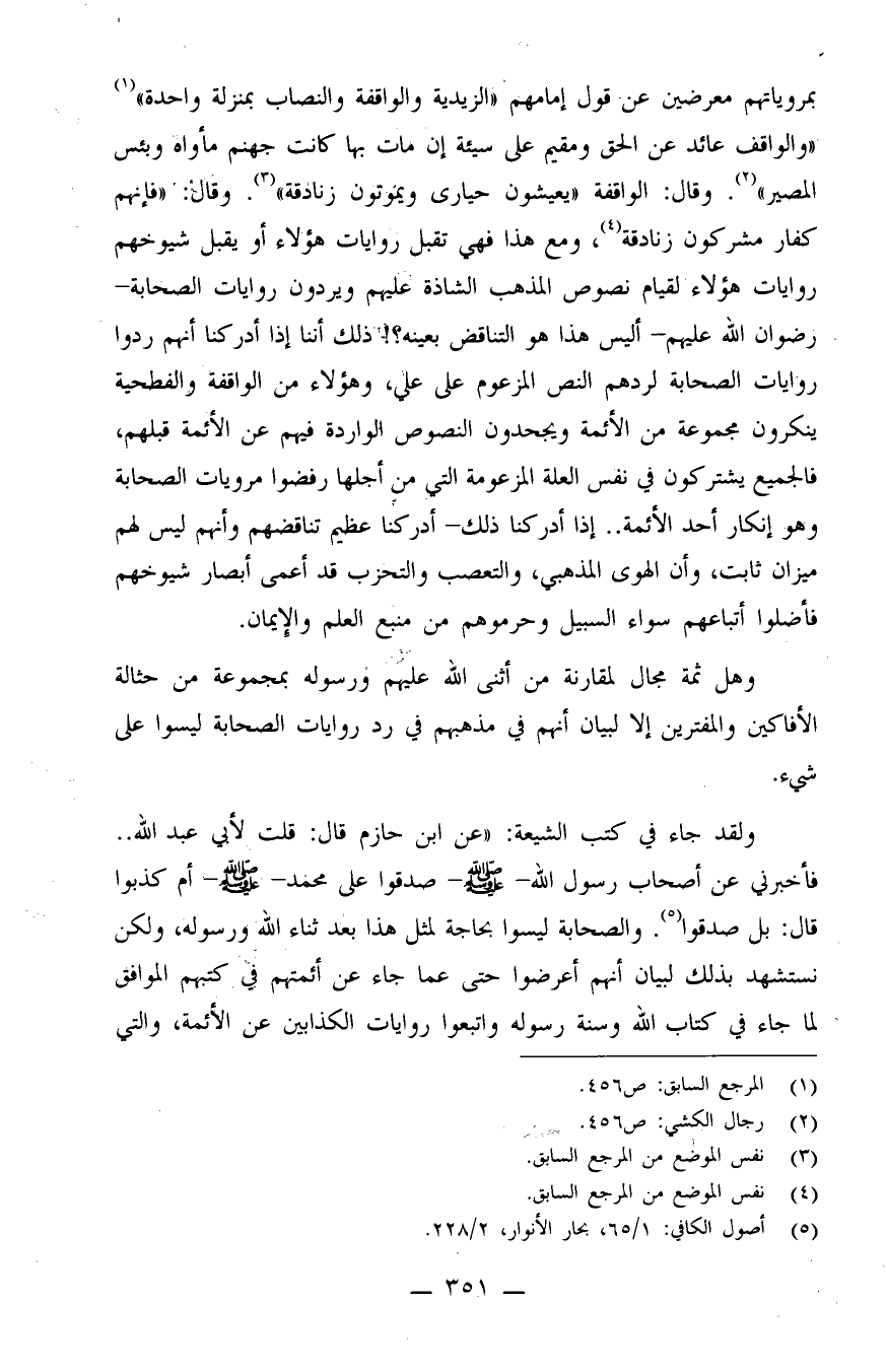 وقال: الواقفة "يعيشون حيارى ويموتون زنادقة" (¬3) . وقال: "فإنهم كفار مشركون زنادقة" (¬4) ، ومع هذا فهي تقبل روايات هؤلاء أو يقبل شيوخهم روايات هؤلاء لقيام نصوص المذهب الشاذة عليهم ويردون روايات الصحابة - رضوان الله عليهم - أليس هذا هو التناقض بعينه؟! ذلك أننا إذا أدركنا أنهم ردوا روايات الصحابة لردهم النص المزعوم على علي، وهؤلاء من الواقفة والفطحية ينكرون مجموعة من الأئمة ويجحدون النصوص الواردة فيهم عن الأئمة قبلهم، فالجميع يشتركون في نفس العلة المزعومة التي من أجلها رفضوا مرويات الصحابة وهو إنكار أحد الأئمة.. إذا أدركنا ذلك - أدركنا عظيم تناقضهم وأنهم ليس لهم ميزان ثابت، وأن الهوى المذهبي، والتعصب والتحزب قد أعمى أبصار شيوخهم فأضلوا أتباعهم سواء السبيل وحرموهم من منبع العلم والإيمان.