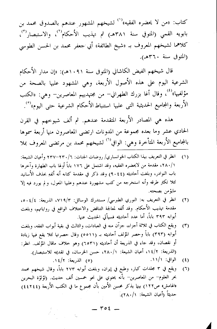 كتاب: "من لا يحضره الفقيه" (¬1) . لشيخهم المشهور عندهم بالصدوق محمد بن بابويه القمي (المتوفى سنة 381هـ) ، ثم تهذيب الأحكام (¬2) ، والاستبصار (¬3) ، كلاهما لشيخهم المعروف بـ"شيخ الطائفة" أبي جعفر محمد بن الحسن الطوسي (المتوفى سنة 360هـ) .
