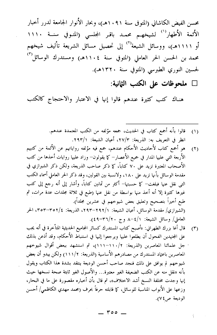 محسن الفيض الكاشاني (المتوفى سنة 1091هـ) ، وبحار الأنوار الجامعة لدرر أخبار الأئمة الأطهار (¬1) . لشيخهم محمد باقر المجلسي (المتوفى سنة 1110 أو 1111هـ) ، ووسائل الشيعة (¬2) . إلى تحصيل مسائل الشريعة تأليف شيخهم محمد بن الحسن الحر العاملي (المتوفى سنة 1104هـ) ، ومستدرك الوسائل (¬3) . لحسين النوري الطبرسي (المتوفى سنة 1320هـ) .