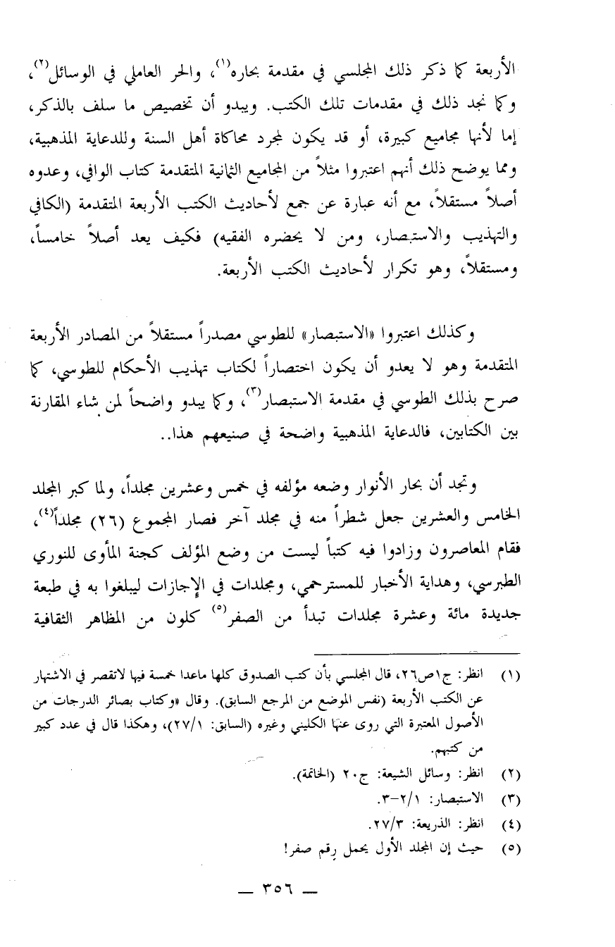 الأربعة، كما ذكر ذلك المجلسي في مقدمة بحاره (¬1) . والحر العاملي في الوسائل (¬2) ، وكما نجد ذلك في مقدمات تلك الكتب. ويبدو أن تخصيص ما سلف بالذكر، إما لأنها مجاميع كبيرة، أو قد يكون لمجرد محاكاة أهل السنة وللدعاية المذهبية، ومما يوضح ذلك أنهم اعتبروا مثلاً من المجاميع الثمانية المتقدمة كتاب الوافي، وعدوه أصلاً مستقلاً، مع أنه عبارة عن جمع لأحاديث الكتب الأربعة المتقدمة (الكافي والتهذيب والاستبصار ومن لا يحضره الفقيه) فكيف يعد أصلاً خامساً، ومستقلاً، وهو تكرار لأحاديث الكتب الأربعة؟!