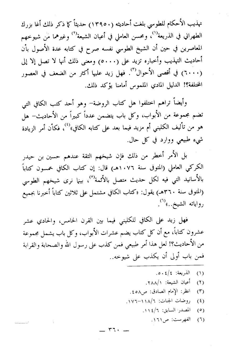 تهذيب الأحكام للطوسي بلغت أحاديثه (13950) حديثاً كما ذكر ذكر أغا بزرك الطهراني في الذريعة (¬1) ، ومحسن العاملي في أعيان الشيعة (¬2) . وغيرهما من شيوخهم المعاصرين، في حين أن الشيخ الطوسي نفسه صرح في كتابه عدة الأصول بأن أحاديث التهذيب وأخباره تزيد على (5000) ، ومعنى ذلك أنها لا تصل إلا إلى (6000) في أقصى الأحوال (¬3) . فهل زيد عليها أكثر من الضعف في العصور المختلفة؟! الدليل المادي الملموس أمامنا يؤكد ذلك.