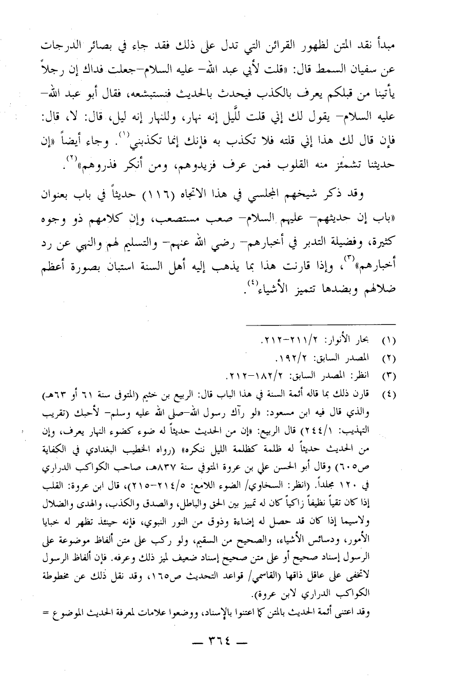 مبدأ نقد المتن لظهور القرائن التي تدل على ذلك، فقد جاء في بصائر الدرجات عن سفيان السمط قال: "قلت لأبي عبد الله - عليه السلام -: جعلت فداك؛ إن رجلاً يأتينا من قبلكم يعرف بالكذب فيحدث بالحديث فنستبشعه، فقال أبو عبد الله - عليه السلام -: يقول لك: إني قلت لليل إنه نهار، وللنهار إنه ليل، قال: لا، قال: فإن قال لك هذا إني قلته فلا تكذب به فإنك إنما تكذبني" (¬1) .