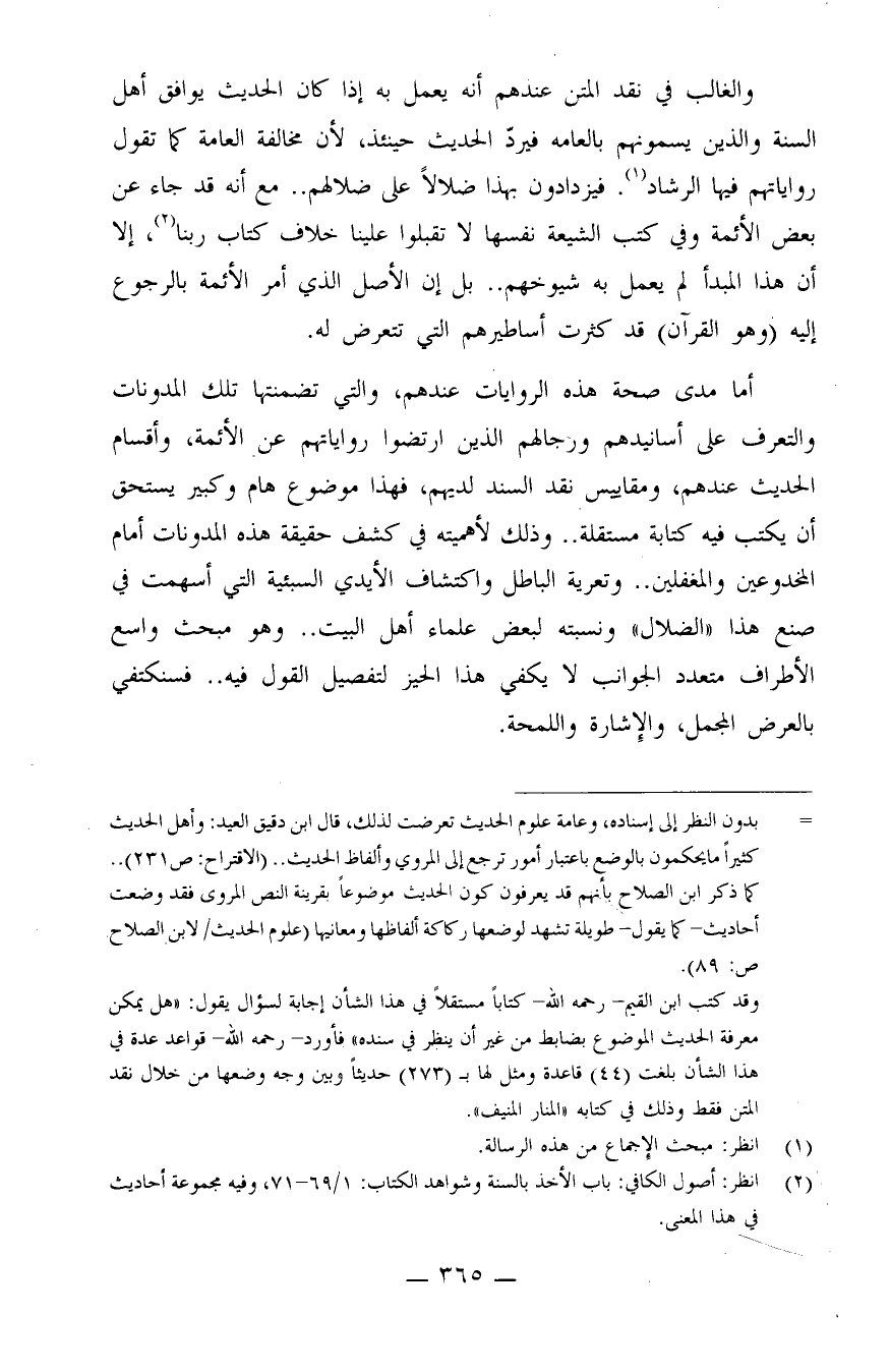 والغالب في النقد المتن عندهم أنه يعمل به إذا كان الحديث يوافق أهل السنة والذين يسمونهم بالعامة فيردّ الحديث حينئذ، لأن مخالفة العامة كما تقول رواياتهم فيها الرشاد (¬1) . فيزدادون بهذا ضلالاً على ضلالهم.. مع أنه قد جاء عن بعض الأئمة وفي كتب الشيعة نفسها: "لا تقبلوا علينا خلاف كتاب ربنا" (¬2) ، إلا أن هذا المبدأ لم يعمل به شيوخهم.. بل إن الأصل الذي أمر الأئمة بالرجوع إليه (وهو القرآن) قد كثرت أساطيرهم التي تتعرض له.