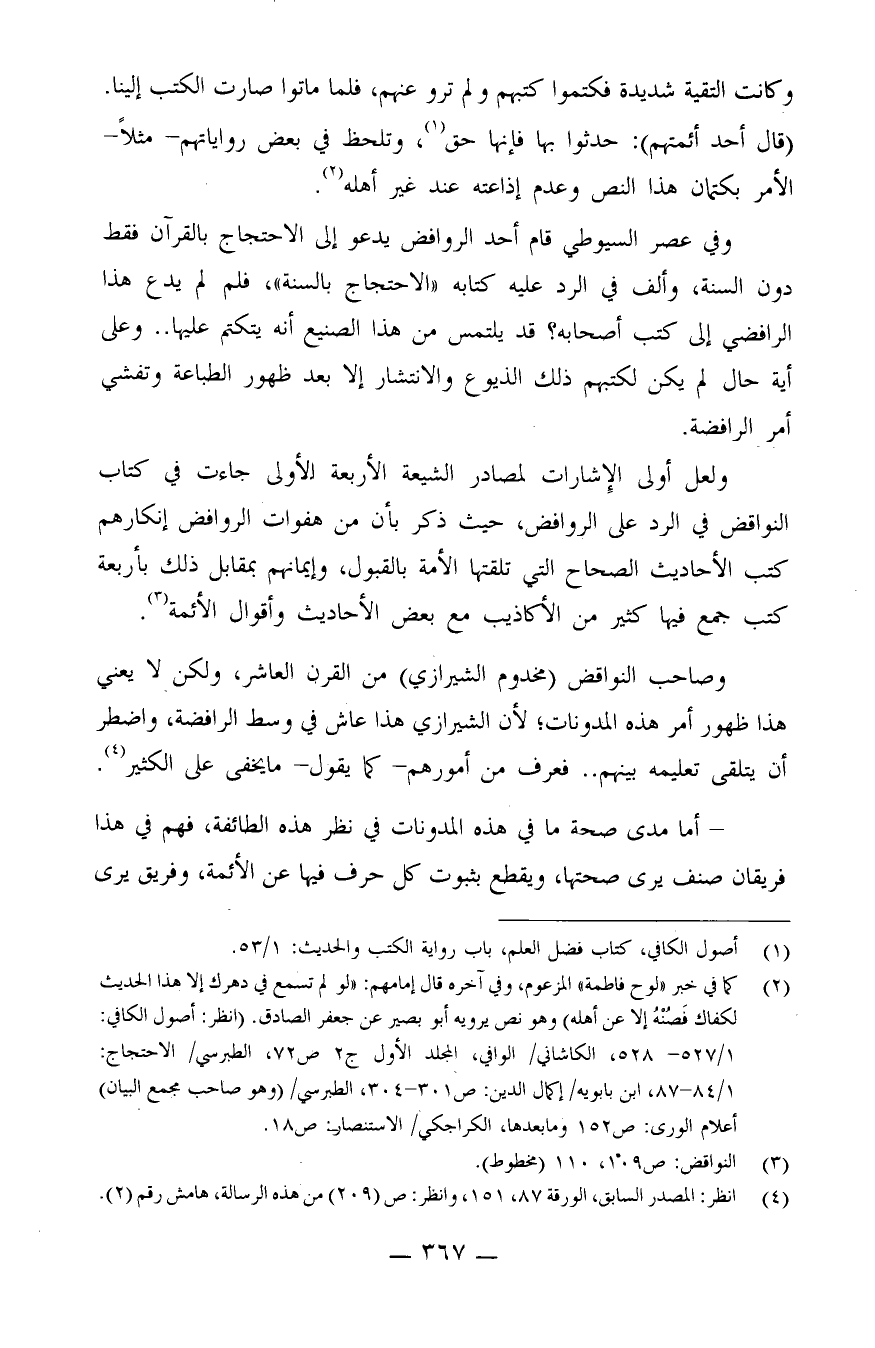 وفي عصر السيوطي قام أحد الروافض يدعو إلى الاحتجاج بالقرآن فقط دون السنة، وألف في الرد عليه كتابه "الاحتجاج بالسنة"، فلم لم يدع هذا الرافضي إلى كتب أصحابه؟ قد يلتمس من هذا الصنيع أنه يتكتم عليها.. وعلى أية حال لم يكن لكتبهم ذلك الذيوع والانتشار إلا بعد ظهور الطباعة وتفشي أمر الرافضة.