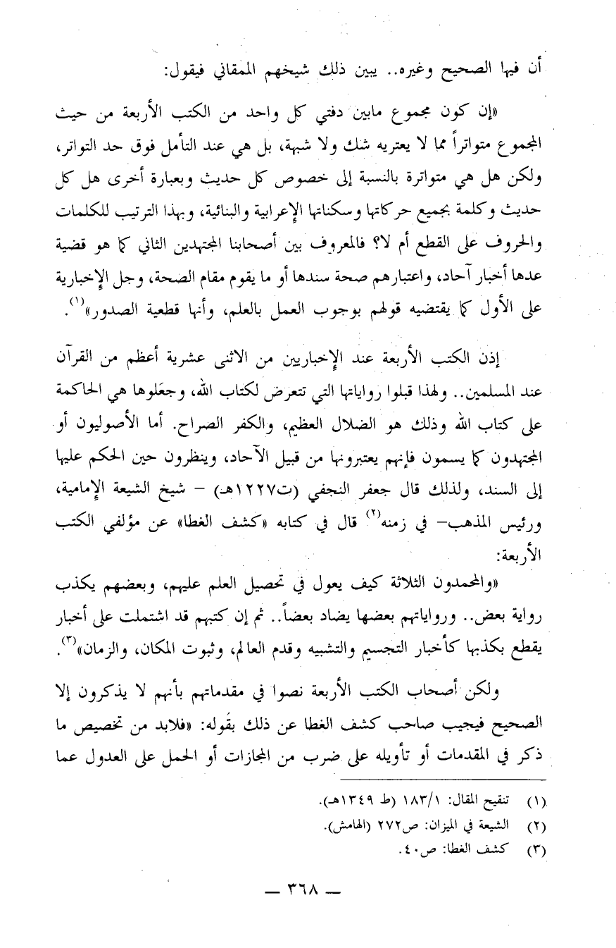 أما الأصوليون أو المجتهدون كما يسمون فإنهم يعتبرونها من قبيل الآحاد، وينظرون حين الحكم عليها إلى السند، ولذلك قال جعفر النجفي (ت1227هـ) - شيخ الشيعة الإمامية، ورئيس المذهب - في زمنه (¬2) . قال في كتابه "كشف الغطا" عن مؤلفي الكتب الأربعة: