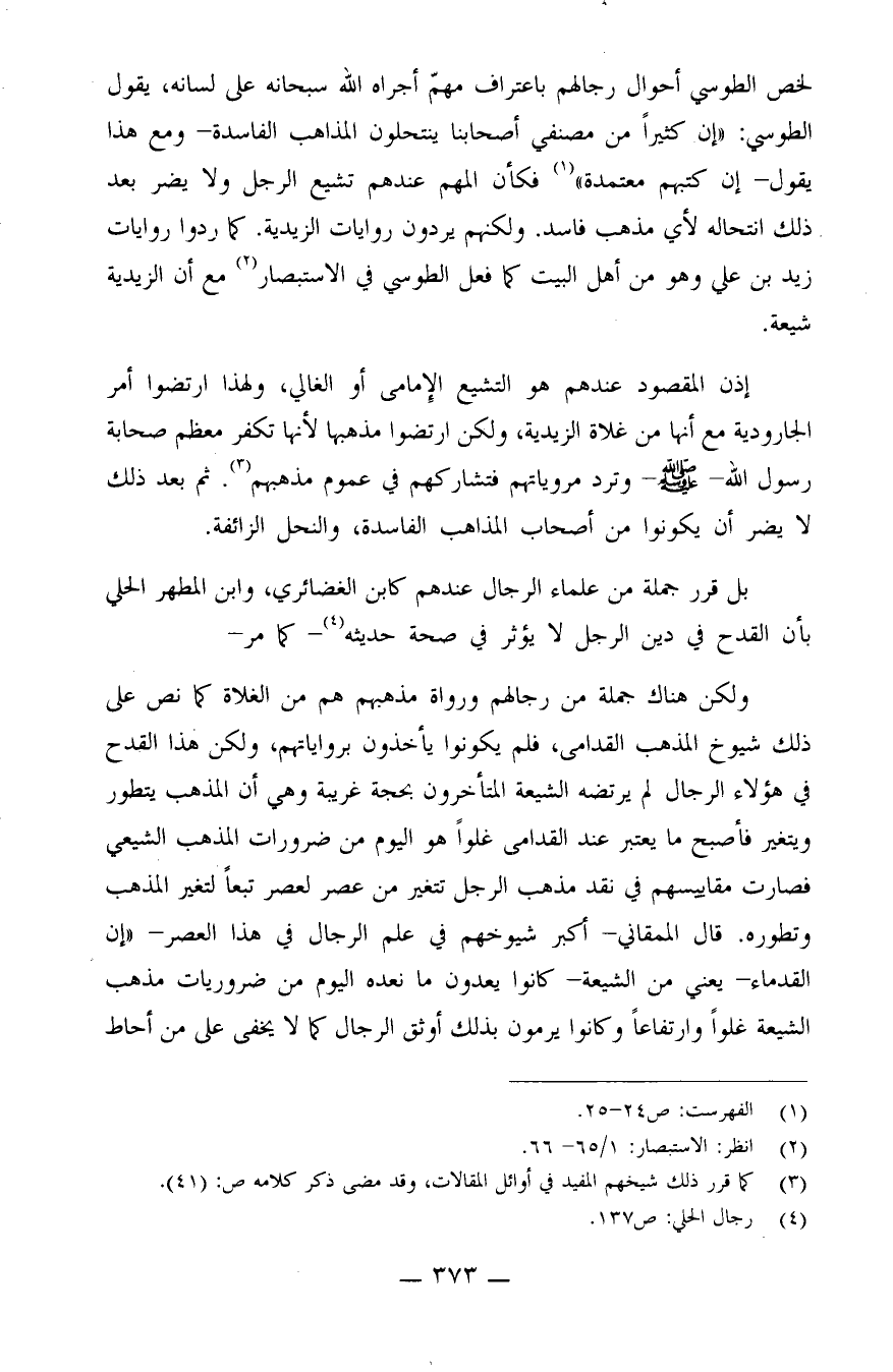 لخص الطوسي أحوال رجالهم باعتراف مهمّ أجراه الله سبحانه على لسانه، يقول الطوسي: "إن كثيراً من مصنفي أصحابنا ينتحلون المذاهب الفاسدة - ومع هذا يقول: إن كتبهم معتمدة -" (¬1) . فكأن المهم عندهم تشيع الرجل ولا يضر بعد ذلك انتحاله لأي مذهب فاسد. ولكنهم يردون روايات الزيدية. كما ردوا روايات زيد بن علي وهو من أهل البيت كما فعل الطوسي في الاستبصار (¬2) . مع أن الزيدية شيعة.