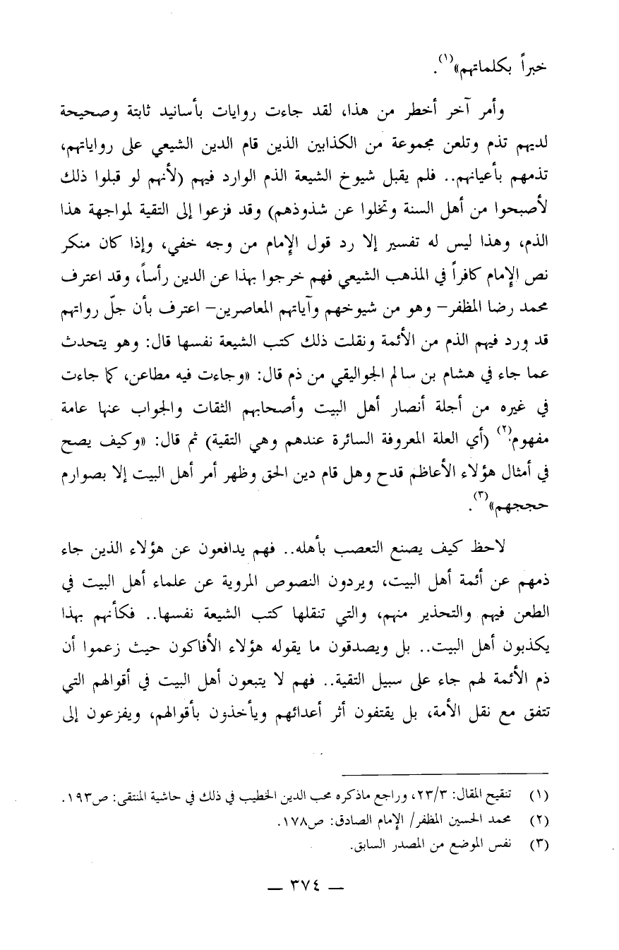 وقد اعترف محمد رضا المظفر - وهو من شيوخهم وآياتهم المعاصرين - اعترف بأن جلّ رواتهم قد ورد فيهم الذم من الأئمة ونقلت ذلك كتب الشيعة نفسها، قال وهو يتحدث عما جاء في هشام بن سالم الجواليقي من ذم قال: "وجاءت فيه مطاعن، كما جاءت في غيره من أجلة أنصار أهل البيت وأصحابهم الثقات والجواب عنها عامة مفهوم" (¬2) . (أي العلة المعروفة السائرة عندهم وهي التقية) ثم قال: "وكيف يصح في أمثال هؤلاء الأعاظم قدح؟ وهل قام دين الحق وظهر أمر أهل البيت إلا بصوارم حججهم" (¬3) .