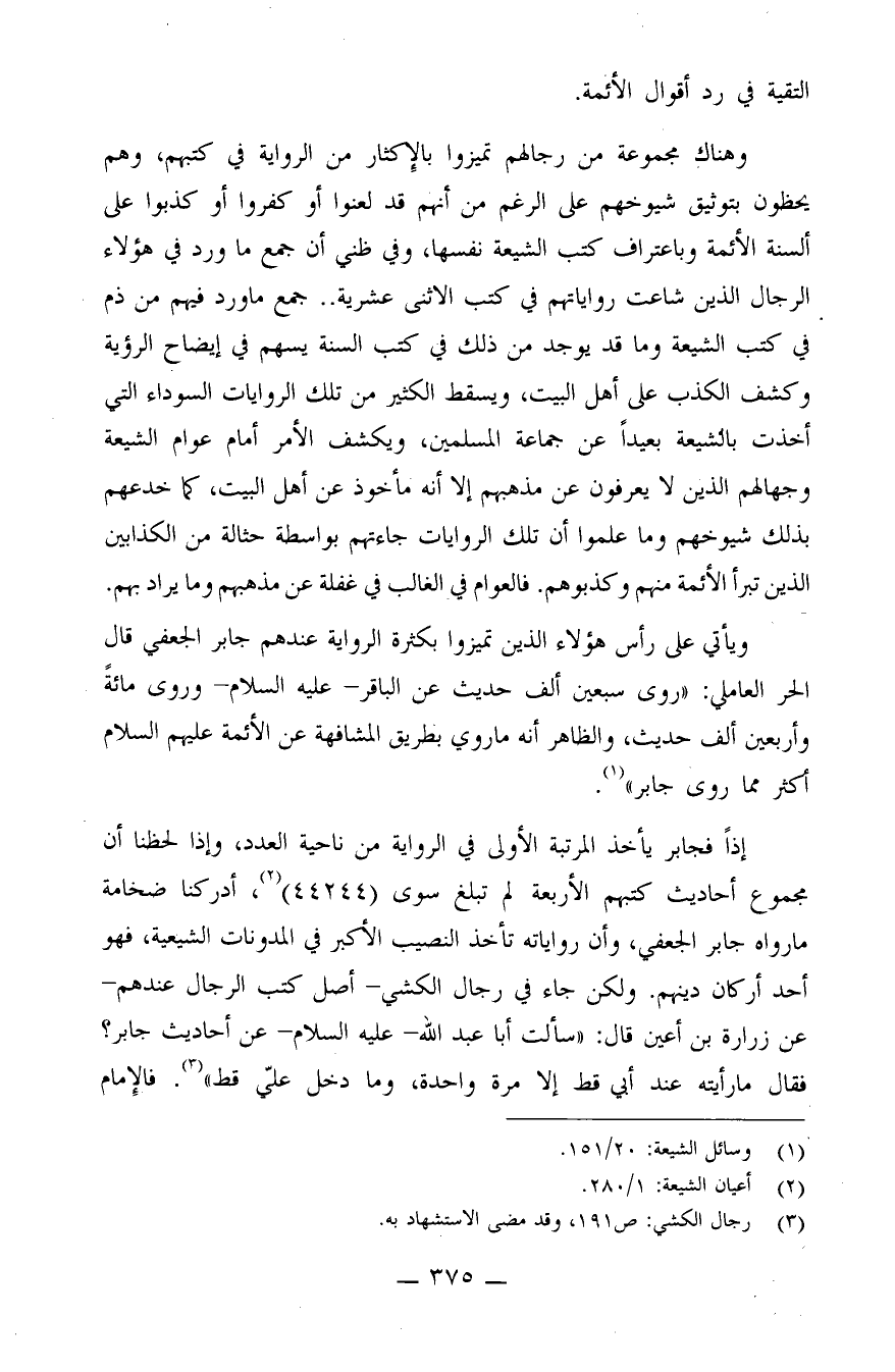 وفي ظني أن جمع ما ورد في هؤلاء الرجال الذين شاعت رواياتهم في كتب الاثني عشرية.. جمع ما ورد فيهم من ذك في كتب الشيعة وما قد يوجد من ذلك في كتب السنة يسهم في إيضاح الرؤية وكشف الكذب على أهل البيت، ويسقط الكثير من تلك الروايات السوداء التي أخذت بالشيعة بعيداً عن جماعة المسلمين، ويكشف الأمر أمام عوام الشيعة وجهالهم الذين لا يعرفون عن مذهبهم إلا أنه مأخوذ عن أهل البيت، كما خدعهم بذلك شيوخهم، وما علموا أن تلك الروايات جاءت بواسطة حثالة من الكذابين الذين تبرأ الأئمة منهن وكذبوهم. فالعوام في الغالب في غفلة من مذهبهم وما يراد بهم.