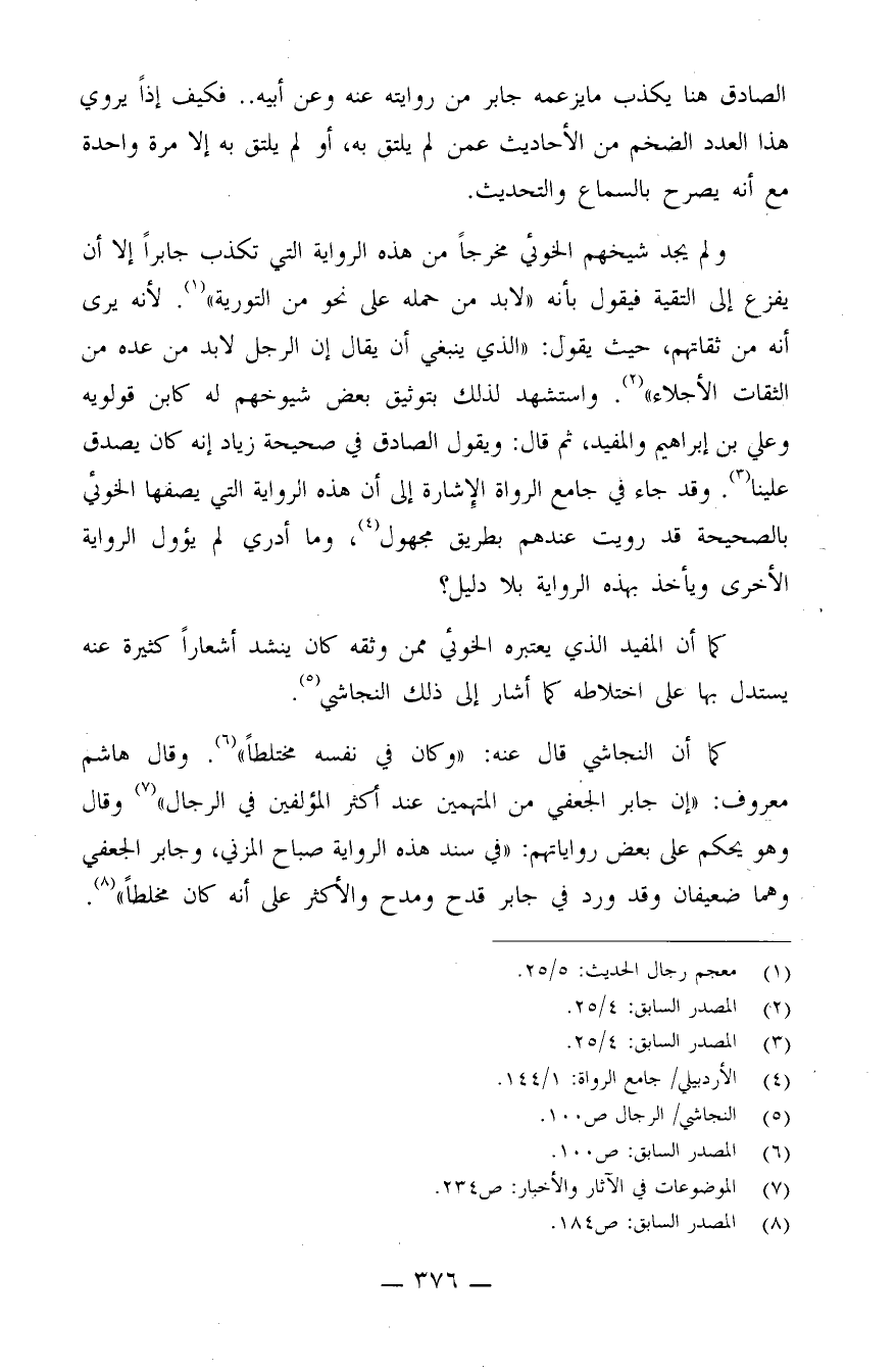 ولم يجد شيخهم الخوئي مخرجاً من هذه الرواية التي تكذب جابراً إلا أن يفزع إلى التقية فيقول بأنه: "لابد من حمله إلى نحو من التورية" (¬1) . لأنه يرى أنه من ثقاتهم، حيث يقول: "الذي ينبغي أن يقال: إن الرجل لابد من عده من الثقات الأجلاء" (¬2) .