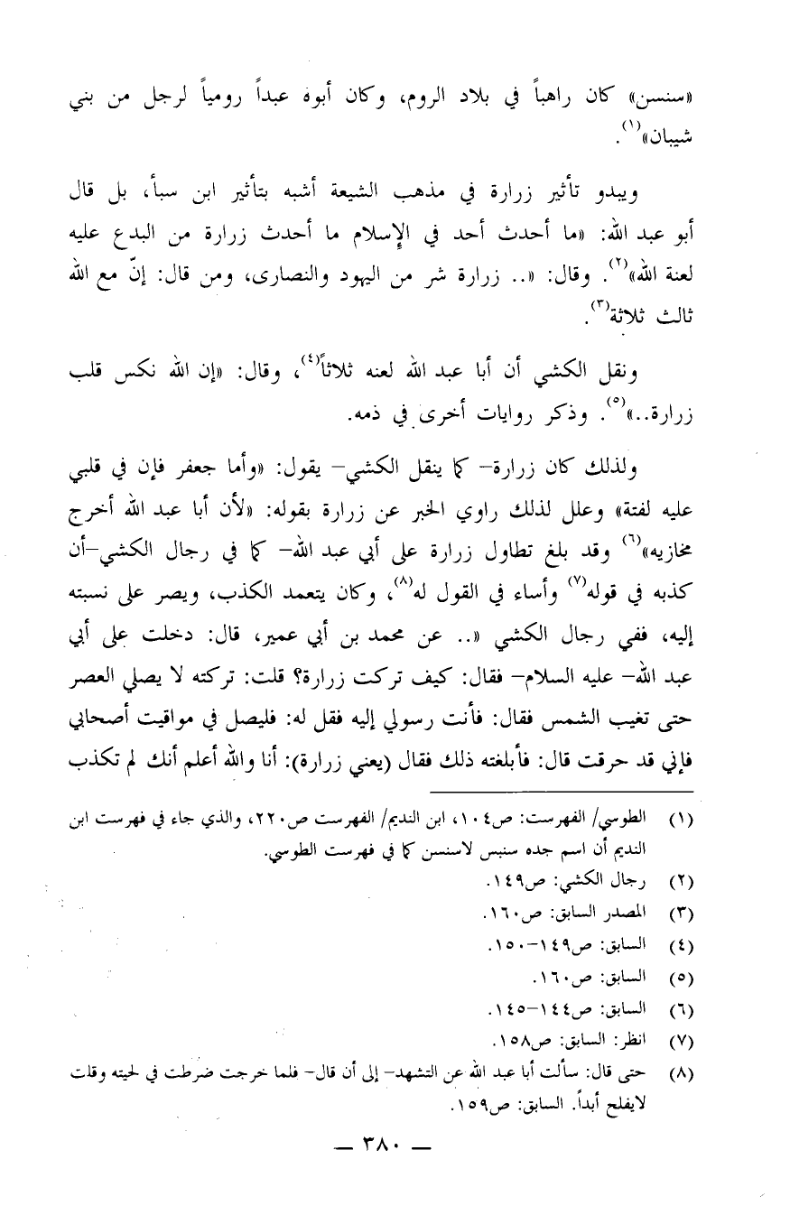 ويبدو تأثير زرارة في مذهب الشيعة أشبه بتأثير ابن سبأ، بل قال أبو عبد الله: "ما أحدث أحد في الإسلام ما أحدث زرارة من البدع عليه لعنة الله" (¬2) . وقال: ".. زرارة شر من اليهود والنصارى، ومن قال: إنّ مع الله ثالث ثلاثة" (¬3) .