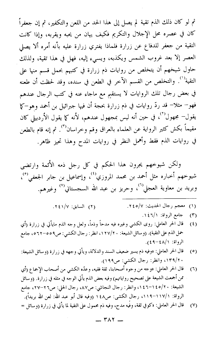 ثم لو كان ذلك الذم تقية لم يصل إلى هذا الحد من اللعن والتكفير، ثم إن جعفراً كان في عصره محل الإجلال والتكريم فكيف يهان من يحبه ويقربه؟، وإذا كانت التقية من جعفر للدفاع عن زرارة فلماذا يفتري زرارة عليه بأنه أمره ألا يصلي العصر إلا بعد غروب الشمس ويكذبه، ويسيء إليه، فهل في هذا تقية؟!، ولذلك حاول شيخهم أن يتخلص من روايات ذم زرارة في كتبهم بحمل قسم منها على التقية (¬1) . والتخلص من القسم الآخر في الطعن في سنده.