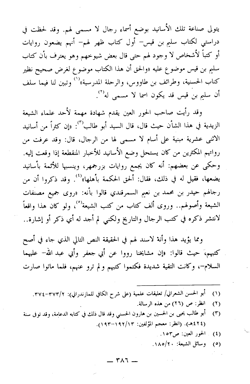 وقد رأيت صاحب الحور العين يقدم شهادة مهمة لأحد علماء الشيعة الزيدية في هذا الشأن حيث قال: قال السيد أبو طالب (¬3) : "إن كثيراً من أسانيد الاثني عشرية مبنية على أسام لا مسمى لها من الرجال، قال: وقد عرفت من رواتهم المكثرين من كان يستحل وضع الأسانيد للأخبار المنقطعة إذا وقعت إليه. وحكي عن بعضهم: أنه كان يجمع روايات بزرجمهر، وينسبها للأئمة بأسانيد يضعها، فقيل له في ذلك، فقال: ألحق الحكمة بأهلها" (¬4) .