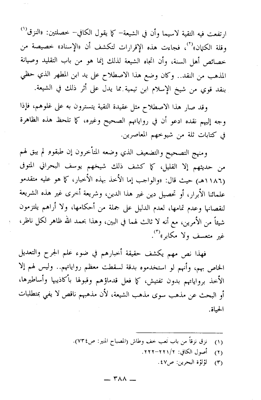 ارتفعت فيه التقية لاسيما وأن في الشيعة - كما يقول الكافي - خصلتين: "النزق (¬1) . وقلة الكتمان" (¬2) ، فجاءت هذه الإقرارات لتكشف أن "الإسناد" خصيصة من خصائص أهل السنة، وأن اتجاه الشيعة لذلك إنما هو من باب التقليد وصيانة المهذب من النقد.. وكان وضع هذا الاصطلاح على يد ابن المطهر الذي حظي بنقد قوي من شيخ الإسلام ابن تيمية مما يدل على أثر ذلك في الشيعة.
