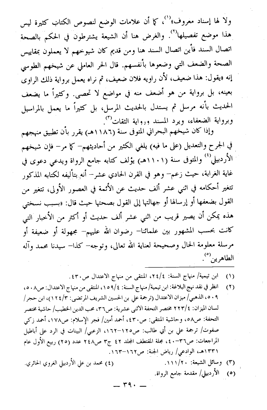 والغرض هنا أن الشيعة يشترطون في الحكم بالصحة اتصال السند فأين اتصال السند هنا؟ ومن قديم كان شيوخهم لا يعملون بمقاييس الصحة والضعف التي وضعوها بأنفسهم. قال الحر العاملي عن شيخهم الطوسي إنه "يقول: هذا ضعيف، لأن روايه فلان ضعيف، ثم نراه يعلم برواية ذلك الرواي بعينه، بل برواية من هو أضعف منه في مواضع لا تحصى. وكثيراً ما يضعف الحديث بأنه مرسل ثم يستدل بالحديث المرسل، بل كثيراً ما يعمل بالمراسيل وبرواية الضعفاء، ويرد المسند ورواية الثقات" (¬3) .