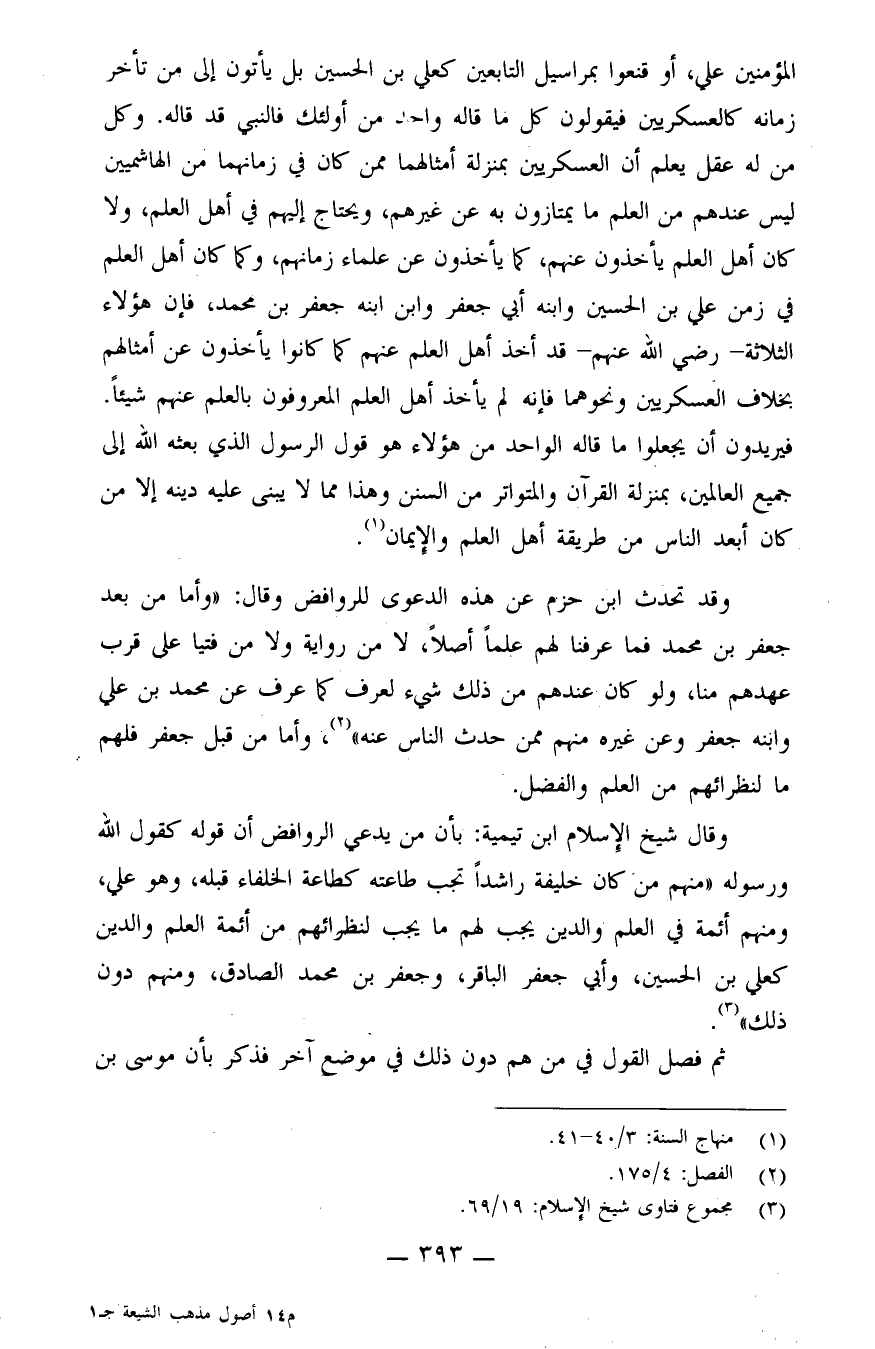 وقال شيخ الإسلام ابن تيمية: بأن من يدعي الروافض أن قوله كقول الله ورسوله: "منهم من كان خليفة راشداً تجب طاعته كطاعة الخلفاء قبله، وهو علي، ومنهم أئمة في العلم والدين يجب لهم ما يجب لنظرائهم من أئمة العلم والدين كعلي بن الحسين، وأبي جعفر الباقر، وجعفر بن محمد الصادق، ومنهم دون ذلك" (¬3) .