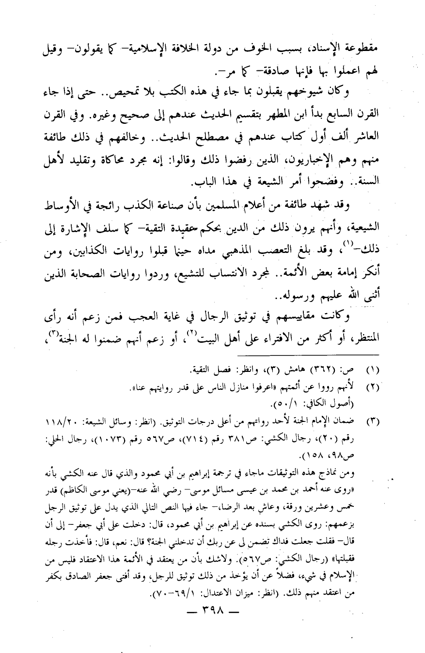 وكان شيوخهم يقبلون بما جاء في هذه الكتب بلا تمحيص.. حتى إذا جاء القرن السابع بدأ ابن المطهر بتقسيم الحديث عندهم إلى صحيح وغيره. وفي القرن ألف أول كتاب عندهم في مصطلح الحديث.. وخالفهم في ذلك طائفة منهم وهم الإخبارون، الذين رفضوا ذلك وقالوا: إنه مجرد محاكاة وتقليد لأهل السنة.. وفضحوا أمر الشيعة في هذا الباب.