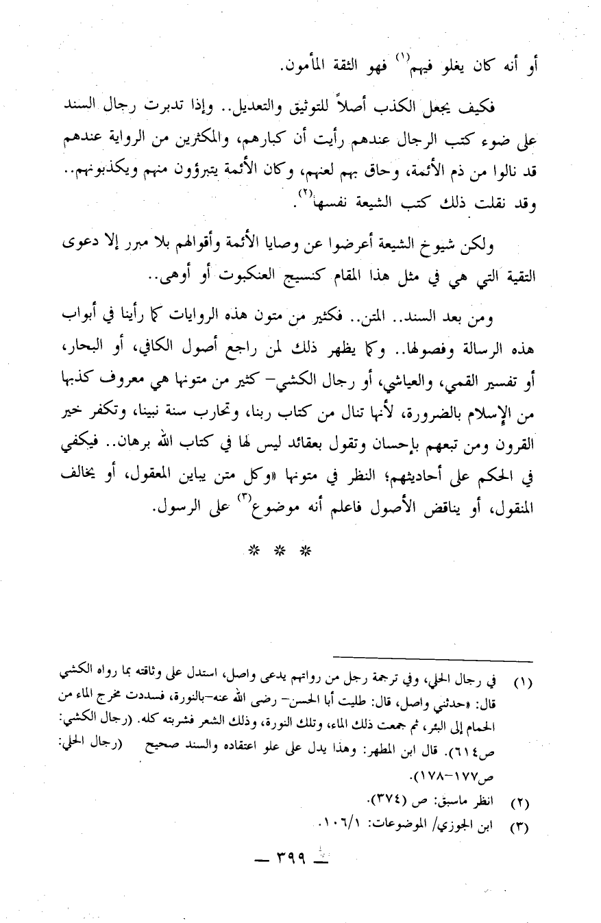 ومن بعد السند.. المتن.. فكثير من متون هذه الروايات كما رأينا في أبواب هذه الرسالة وفصولها.. وكما يظهر ذلك لمن راجع أصول الكافي، أو البحار، أو تفسير القمي، والعياشي، أو رجال الكشي - كثير من متونها هي معروف كذبها من الإسلام بالضرورة، لأنها تنال من كتاب ربنا، وتحارب سنة نبينا، وتكفر خير القرون ومن تبعهم بإحسان، وتقول بعقائدنا ليس لها في كتاب الله برهان..