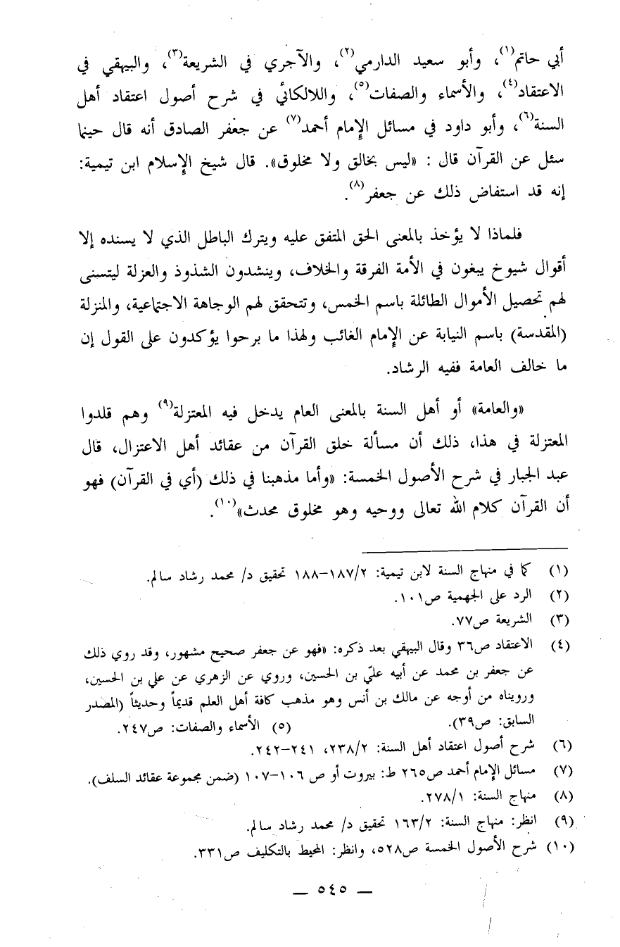 أبي حاتم (¬1) ، وأبو سعيد الدارمي (¬2) ، والآجري في الشريعة (¬3) ، والبيهقي في الاعتقاد (¬4) ، والأسماء والصفات (¬5) ، واللالكائي في شرح أصول اعتقاد أهل السنة (¬6) ، وابو داود في مسائل الإمام أحمد (¬7) . عن جعفر الصادق أنه قال حينما سئل عن القرآن قال: "ليس بخالق ولا مخلوق". قال شيخ الإسلام ابن تيمية: إنه قد استفاض ذلك عن جعفر (¬8) .