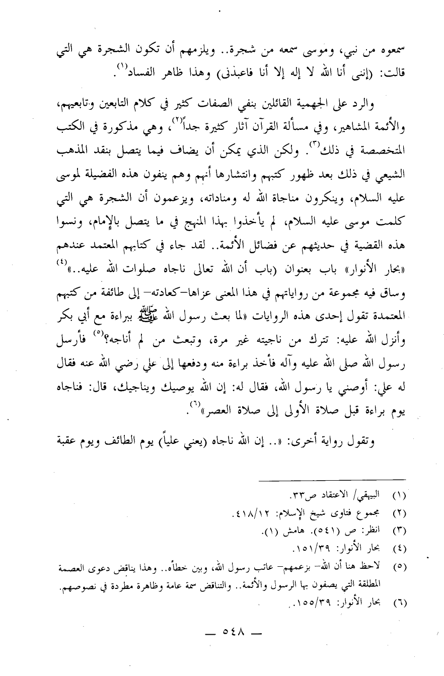 والرد على الجهمية القائلين بنفي الصفات كثير في كلام التابعين وتابعيهم، والأئمة المشاهير، وفي مسألة القرآن آثار كثيرة جدًا (¬2) ، وهي مذكورة في الكتب المتخصصة في ذلك (¬3) . ولكن الذي يمكن أن يضاف فيما يتصل بنقد المذهب الشيعي في ذلك بعد ظهور كتبهم وانتشارها أنهم وهم ينفون هذه الفضيلة لموسى عليه السلام، وينكرون مناجاة الله له ومناداته، ويزعمون أن الشجرة هي التي كلمت موسى عليه السلام - لم يأخذوا بهذا المنهج فيما يتصل بالإمام، ونسوا هذه القضية في حديثهم عن فضائل الأئمة.. لقد جاء في كتابهم المعتمد عندهم "بحار الأنوار" باب بعنوان "باب أنّ الله تعالى ناجاه صلوات الله عليه.." (¬4) . وساق فيه مجموعة من رواياتهم في هذا المعنى عزاها - كعادته - إلى طائفة من كتبهم المعتمدة.