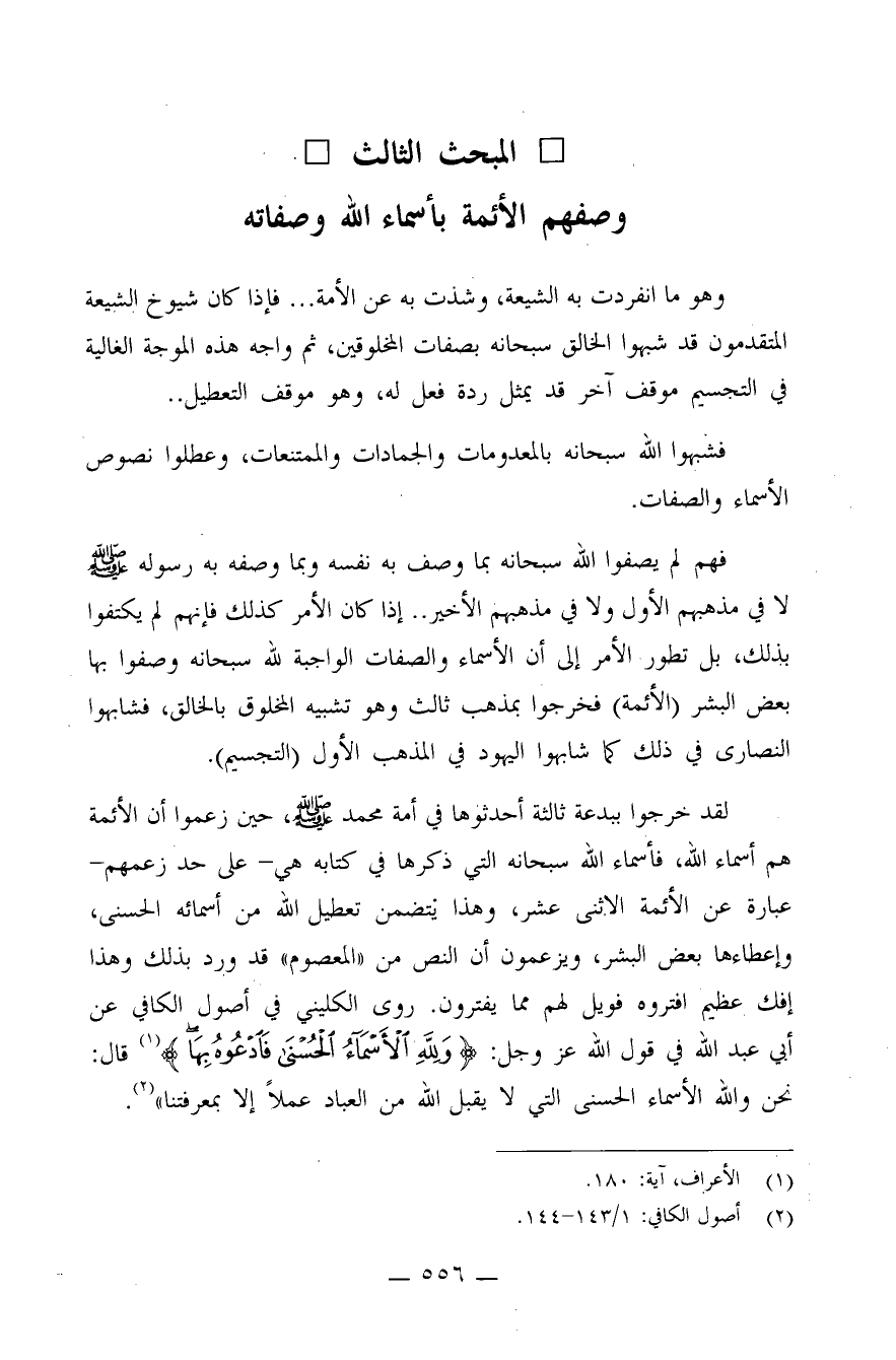فهم لم يصفوا الله سبحانه بما وصف به نفسه وبما وصفه به رسوله صلى الله عليه وسلم لا في مذهبهم الأول ولا في مذهبهم الأخير.. إذا كان الأمر كذلك فإنهم لم يكتفوا بذلك، بل تطور الأمر إلى أن الأسماء والصفات الواجبة لله سبحانه وصفوا بها بعض البشر (الأئمة) فخرجوا بمذهب ثالث وهو تشبيه المخلوق بالخالق، فشابهوا النصارى في ذلك كما شابهوا اليهود في المذهب الأول (التجسيم) .