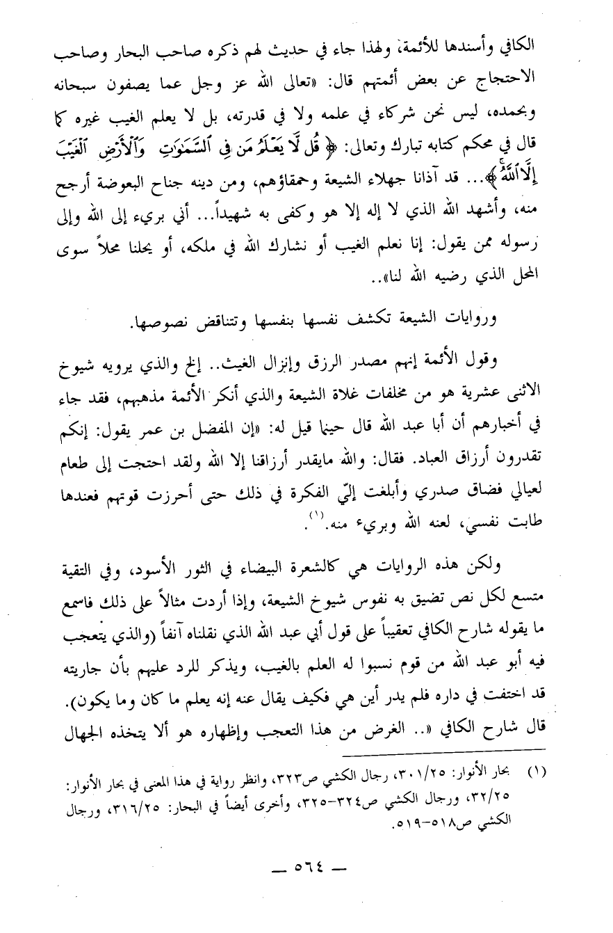 الكافي وأسندها للأئمة، ولهذا جاء في حديث لهم ذكره صاحب البحار وصاحب الاحتجاج عن بعض أئمتهم قال: "تعالى الله عز وجل عما يصفون سبحانه وبحمده، ليس نحن شركاء في علمه ولا في قدرته، بل لا يعلم الغيب غيره، كما قال في محكم كتابه تبارك وتعالى: {قُل لا يَعْلَمُ مَن فِي السَّمَاوَاتِ وَالأَرْضِ الْغَيْبَ إِلا اللَّهُ} (¬1) أني بريء إلى الله وإلى رسوله ممن يقول: إنا نعلم الغيب أو نشارك الله في ملكه، أو يحلنا محلاً سوى المحل الذي رضيه الله لنا".