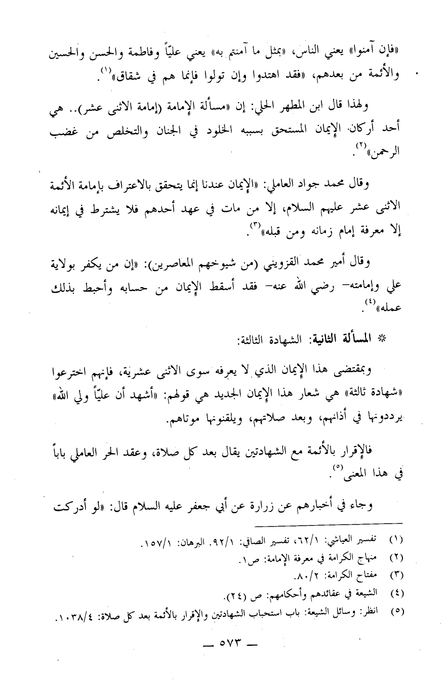 ولهذا قال ابن المطهر الحلي: "إن مسألة الإمامة (إمامة الاثني عشر) هي أحد أركان الإيمان المستحق بسببه الخلود في الجنان والتخلص من غضب الرحمن" (¬2) .