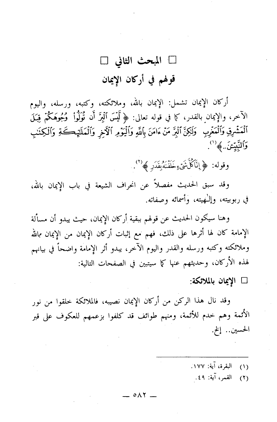 وهنا سيكون الحديث عن قولهم في بقية أركان الإيمان، حيث يبدو أن مسألة الإمامة كان لها أثرها على ذلك، فهم مع إثبات أركان الإيمان من الإيمان بالله وملائكته وكتبه ورسله والقدر واليوم الآخر، يبدو أثر الإمامة واضحًا في بيانهم لهذه الأركان، وحديثهم عنها، كما سيتبين في الصفحات التالية: