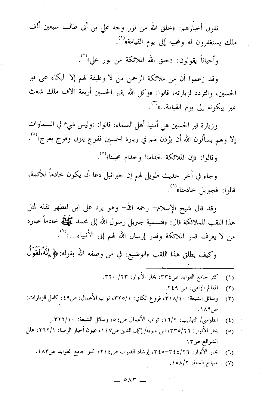 وقد قال شيخ الإسلام - رحمه الله - وهو يرد على ابن المطهر نقله لمثل هذا اللقب للملائكة قال: "فتسمية جبريل رسول الله إلى محمد صلى الله عليه وسلم خادمًا عبارة من لا يعرف قدر الملائكة وقدر إرسال الله لهم إلى الأنبياء.." (¬7) .
