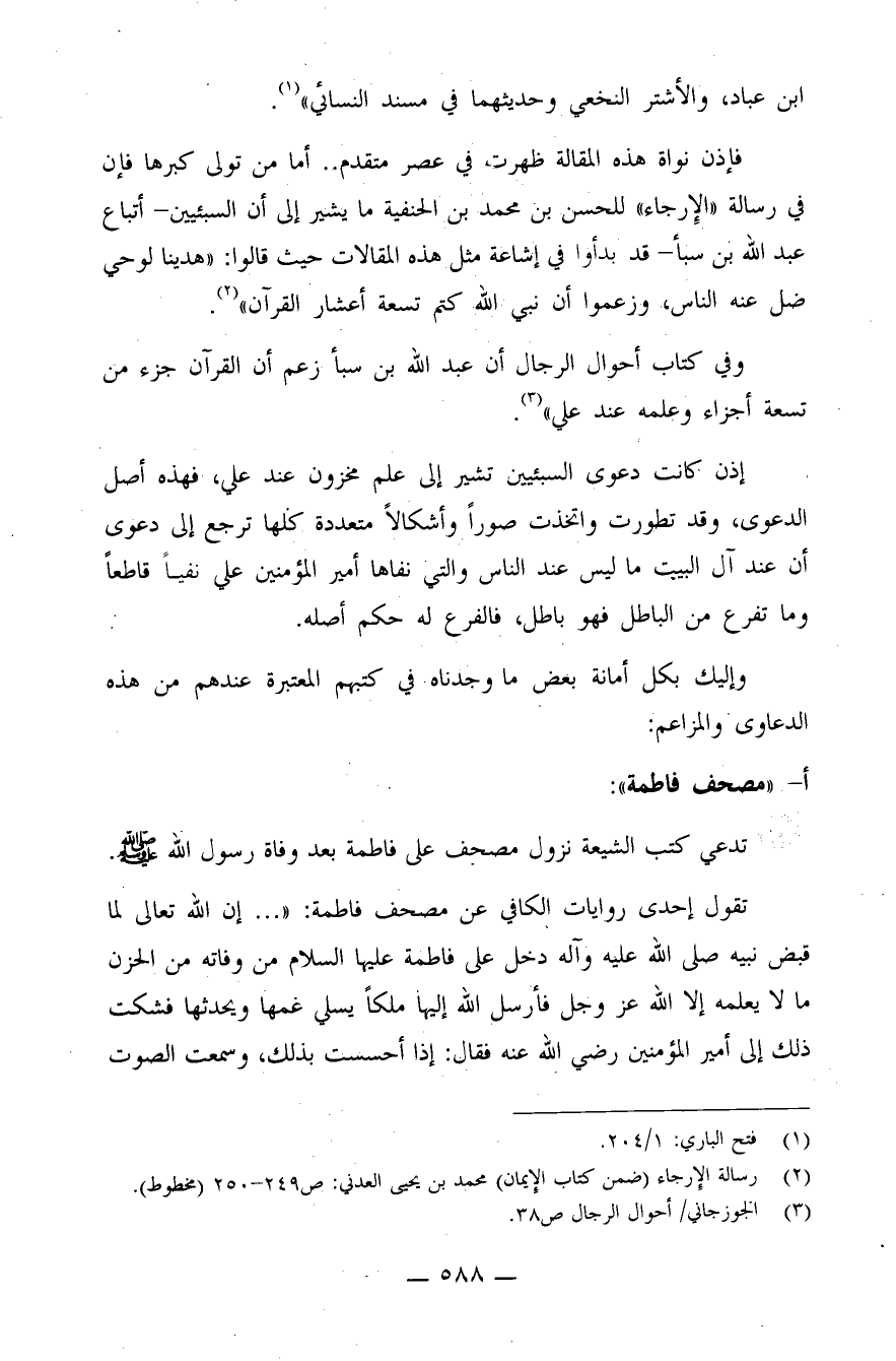 فإذن نواة هذه المقالة ظهرت في عصر متقدم.. أما من تولى كبرها فإن في رسالة "الإرجاء" للحسن بن محمد بن الحنفية ما يشير إلى أن السبئيين - أتباع عبد الله بن سبأ - قد بدأوا في إشاعة مثل هذه المقالات حيث قالا: "هدينا لوحي ضل عنه الناس، وزعموا أن نبي الله كتم تسعة أعشار القرآن" (¬2) .