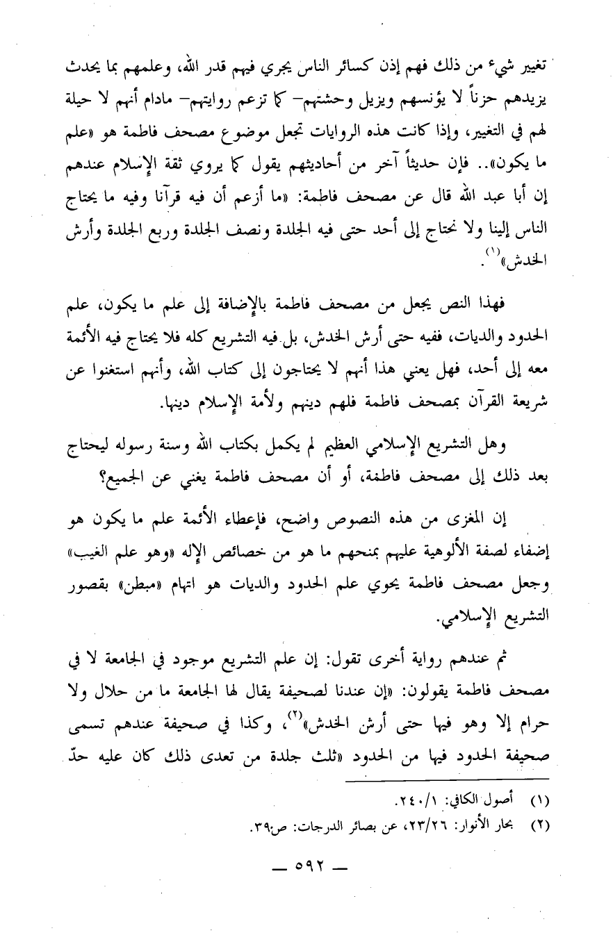 فهذا النص يجعل من مصحف فاطمة بالإضافة إلى علم ما يكون، علم الحدود والديات، ففيه حتى أرش الخدش، بل فيه التشريع كله فلا يحتاج فيه الأئمة معه إلى أحد، فهي يعني هذا أنهم لا يحتاجون إلى كتاب الله، وأنهم استغنوا عن شريعة القرآن بمصحف فاطمة فلهم دينهم ولأمة الإسلام دينها؟!