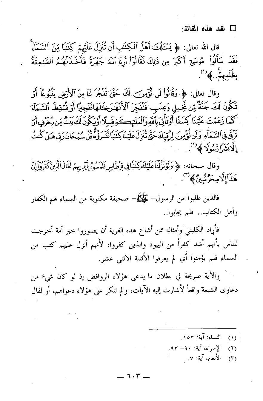 فأراد الكليني وأمثاله ممن أشاع هذه الفرية أن يصوروا خير أمة أخرجت للناس بأنهم أشد كفرًا من اليهود والذين كفروا؛ لأنهم أنزل عليهم كتب من السماء فلم يؤمنوا أي لم يعرفوا الأئمة الاثني عشر.