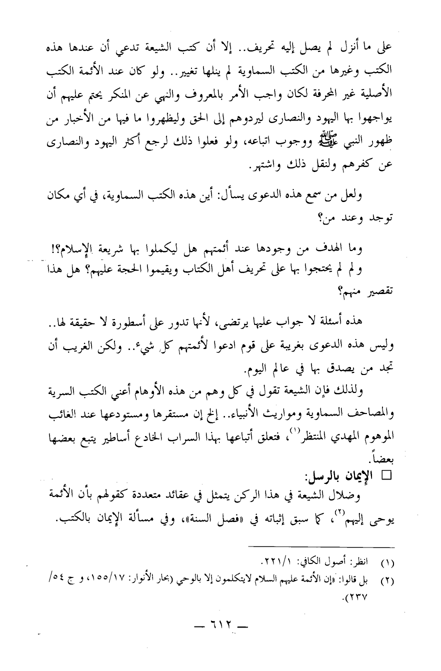 وضلال الشيعة في هذا الركن يتمثل في عقائد متعددة كقولهم بأن الأئمّة يُوحى إليهم (¬2) ، كما سبق إثباته في "فصل السنة"، وفي مسألة الإيمان بالكتب.