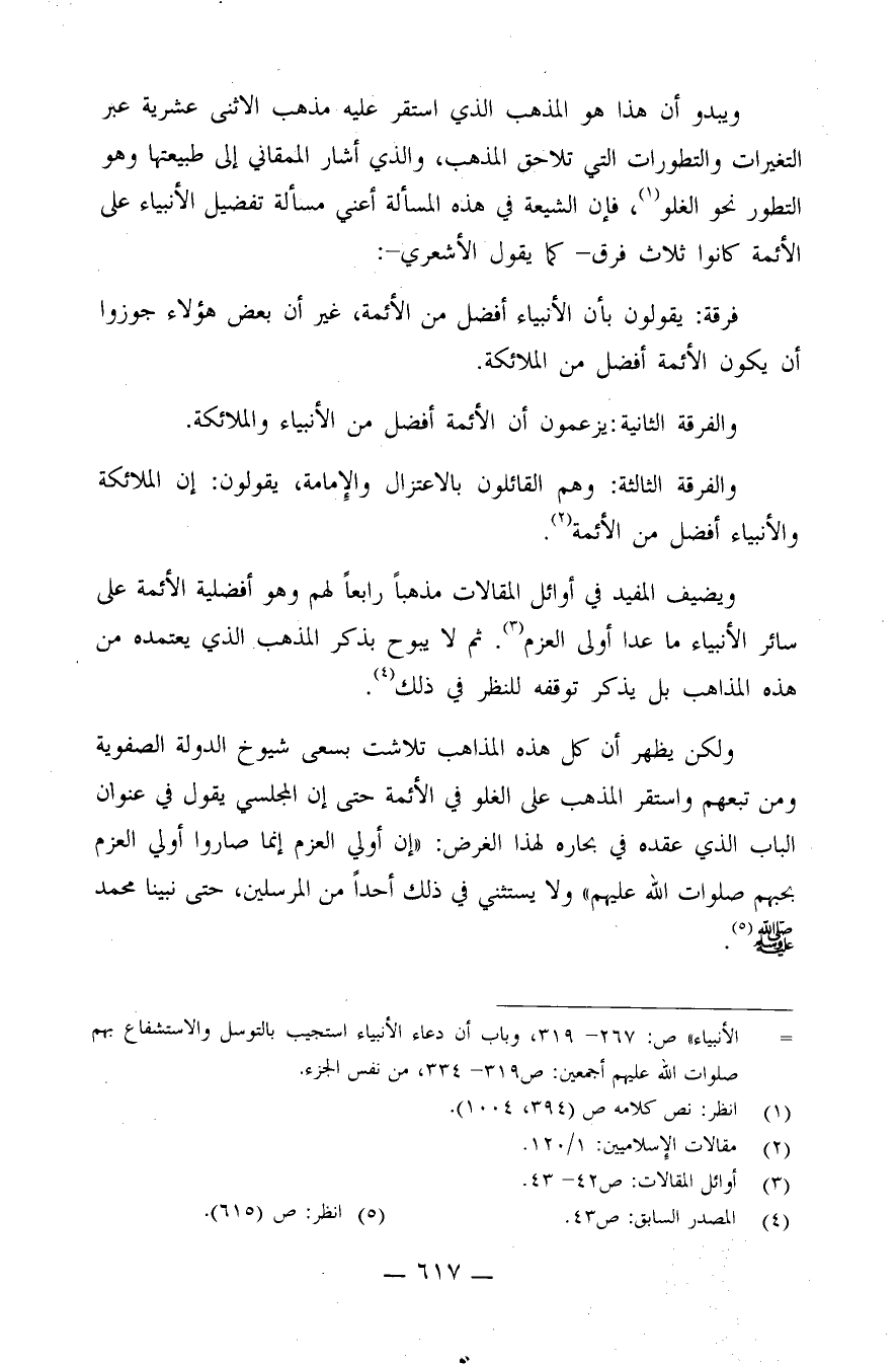 ويبدو أن هذا هو المذهب الذي استقر عليه مذهب الاثني عشرية عبر التغيرات والتطورات التي تلاحق المذهب، والذي أشار الممقاني إلى طبيعتها وهو التطور نحو الغلو (¬1) ، فإن الشيعة في هذه المسألة (أعني مسألة تفضيل الأنبياء على الأئمة) كانوا ثلاث فرق - كما يقول الأشعري -: