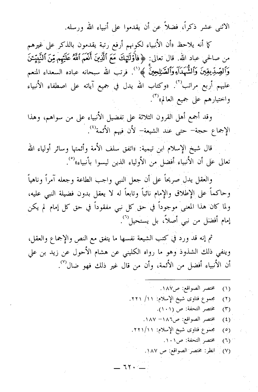 ثم إنّه قد ورد في كتب الشّيعة نفسها ما يتّفق مع النّصّ والإجماع والعقل، وينفي ذلك الشّذوذ؛ وهو ما رواه الكليني عن هشام الأحول عن زيد بن علي أنّ الأنبياء أفضل من الأئمّة، وأنّ من قال غير ذلك فهو ضالّ (¬8) .