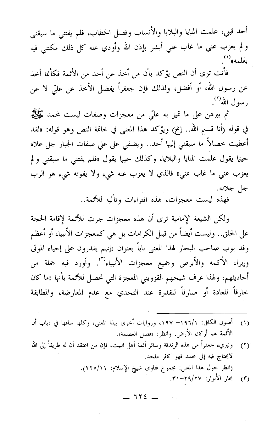 ولكن الشيعة الإمامية ترى أن هذه معجزات جرت للأئمة لإقامة الحجة على الخلق.. وليست أيضًا من قبيل الكرامات بل هي كمعجزات الأنبياء أو أعظم، وقد بوّب صاحب البحار لهذا المعنى بابًا بعنوان "إنّهم يقدرون على إحياء الموتى وإبراء الأكمه والأبرص وجميع معجزات الأنبياء" (¬3) . وأورد فيه جملة من أحاديثهم، ولهذا عرف شيخهم القزويني المعجزة التي تحصل للأئمة بأنها "ما كان خارقًا للعادة أو صارفًا للقدرة عند التحدي مع عدم المعارضة، والمطابقة