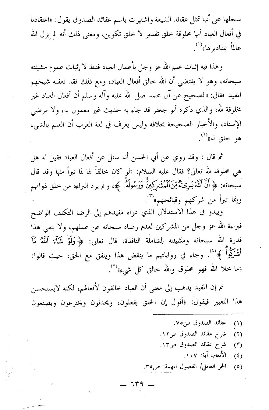 وهذا فيه إثبات علم الله عز وجل بأعمال العباد فقط لا إثبات عموم مشيئته سبحانه، وهو لا يقتضي أن الله خالق أفعال العباد، ومع ذلك فقد تعقبه شيخهم المفيد فقال: "الصحيح عن آل محمد صلى الله عليه وسلم أن أفعال العباد غير مخلوقة لله، والذي ذكره أبو جعفر قد جاء به حديث غير معمول به، ولا مرضي الإسناد، والأخبار الصحيحة بخلافه، وليس يعرف في لغة العرب أن العلم بالشيء هو خلق له" (¬2) .