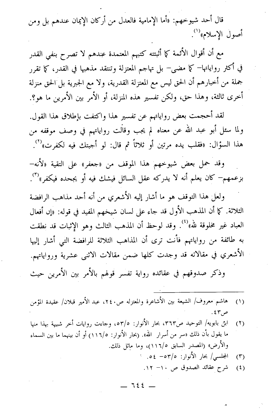 ولعل هذا التوقف هو ما أشار إليه الأشعري من أنه أحد مذاهب الرافضة الثلاثة. كما أن المذهب الأول قد جاء على لسان شيخهم المفيد في قوله: "إن أفعال العباد غير مخلوقة لله" (¬4) . وقد لوحظ أن المذهب الثالث وهو الإثبات قد نطقت به طائفة من رواياتهم، فأنت ترى أن المذاهب الثلاثة للرافضة التي أشار إليها الأشعري في مقالاته قد وجدت كلها ضمن مقالات الاثني عشرية ورواياتهم.