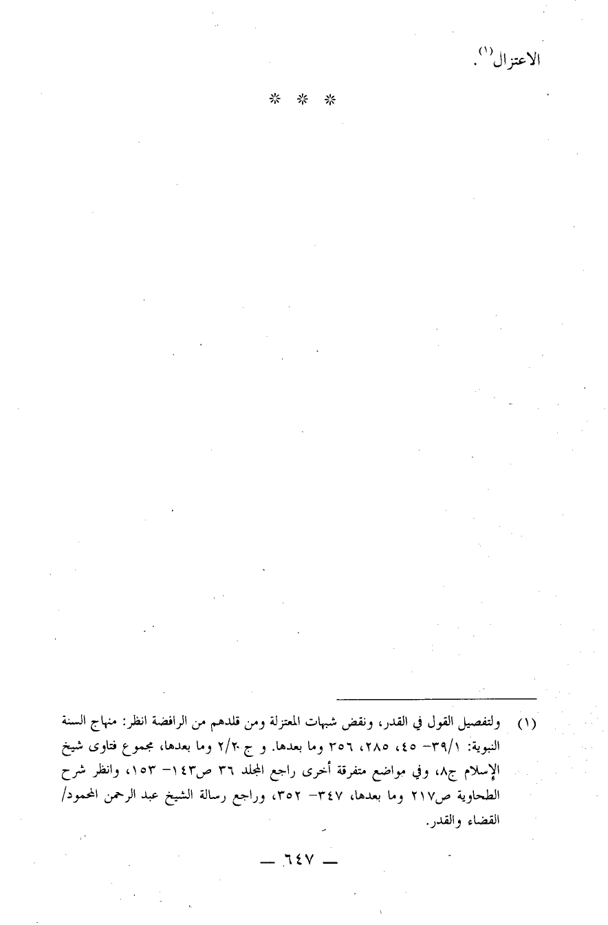 (¬1) ولتفصيل القول في القدر، ونقض شبهات المعتزلة ومن قلدهم من الرافضة انظر: منهاج السنة النبوية: 1/39-45، 285، 356 وما بعدها. وج/2 وما بعدها، مجموع فتاوى شيخ الإسلام ج، وفي مواضع متفرقة أخرى راجع المجلد 36 ص143-153، وانظر شرح الطحاوية ص217 وما بعدها، 347-352، وراجع رسالة الشيخ عبد الرحمن المحمود/ القضاء والقدر