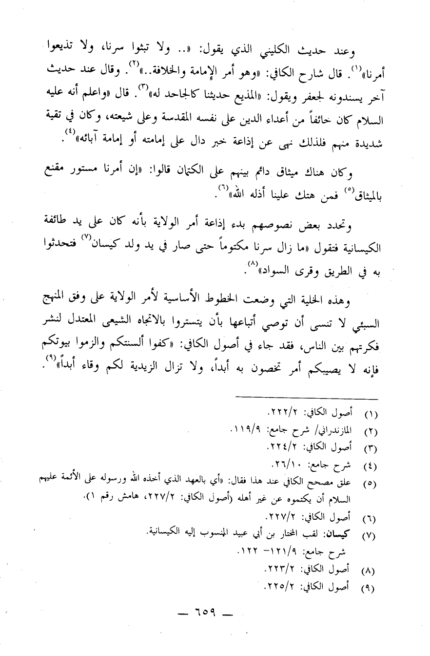 وعند حديث الكليني الذي يقول: ".. ولا تبثّوا سرّنا، ولا تذيعوا أمرنا" (¬1) . قال شارح الكافي: "وهو أمر الإمامة والخلافة.." (¬2) . وقال عند حديث آخر يسندونه لجعفر ويقول: "المذيع حديثنا كالجاحد له" (¬3) . قال: "واعلم أنّه عليه السّلام كان خائفًا من أعداء الدّين على نفسه المقدّسة وعلى شيعته، وكان في تقية شديدة منهم فلذلك نهى عن إذاعة خبر دالّ على إمامته أو إمامة آبائه" (¬4) .