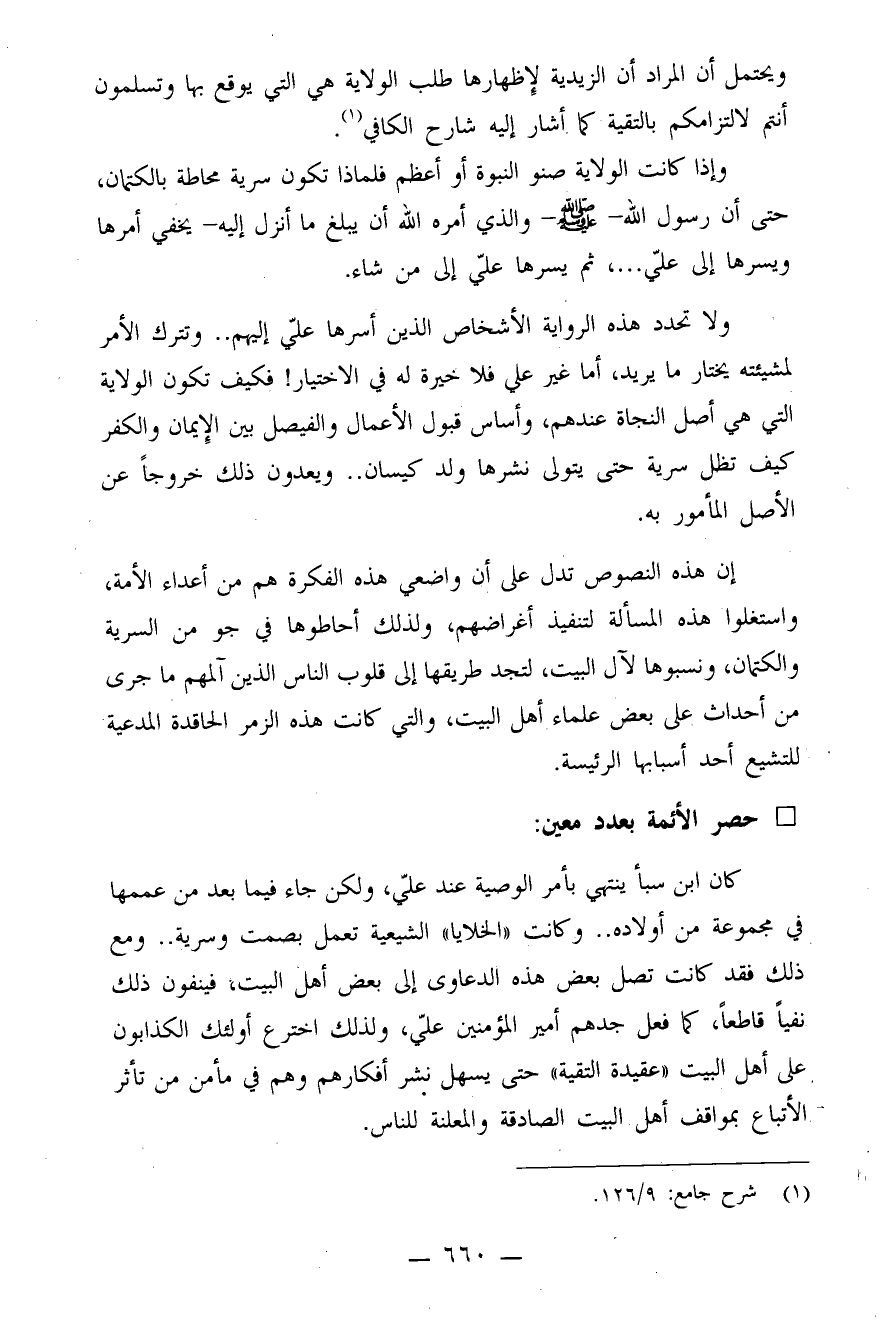 كان ابن سبأ ينتهي بأمر الوصية عند عليّ، ولكن جاء فيما بعد من عممها في مجموعة من أولاده.. وكانت "الخلايا" الشيعية تعمل بصمت وسرية.. ومع ذلك فقد كانت تصل بعض هذه الدعاوى إلى بعض أهل البيت، فينفون ذلك نفيًا قاطعًا، كما فعل جدهم أمير المؤمنين عليّ، ولذلك اخترع أولئك الكذابون على أهل البيت "عقيدة التقية" حتى يسهل نشر أفكارهم وهم في مأمن من تأثر الأتباع بمواقف أهل البيت الصادقة والمعلنة للناس.