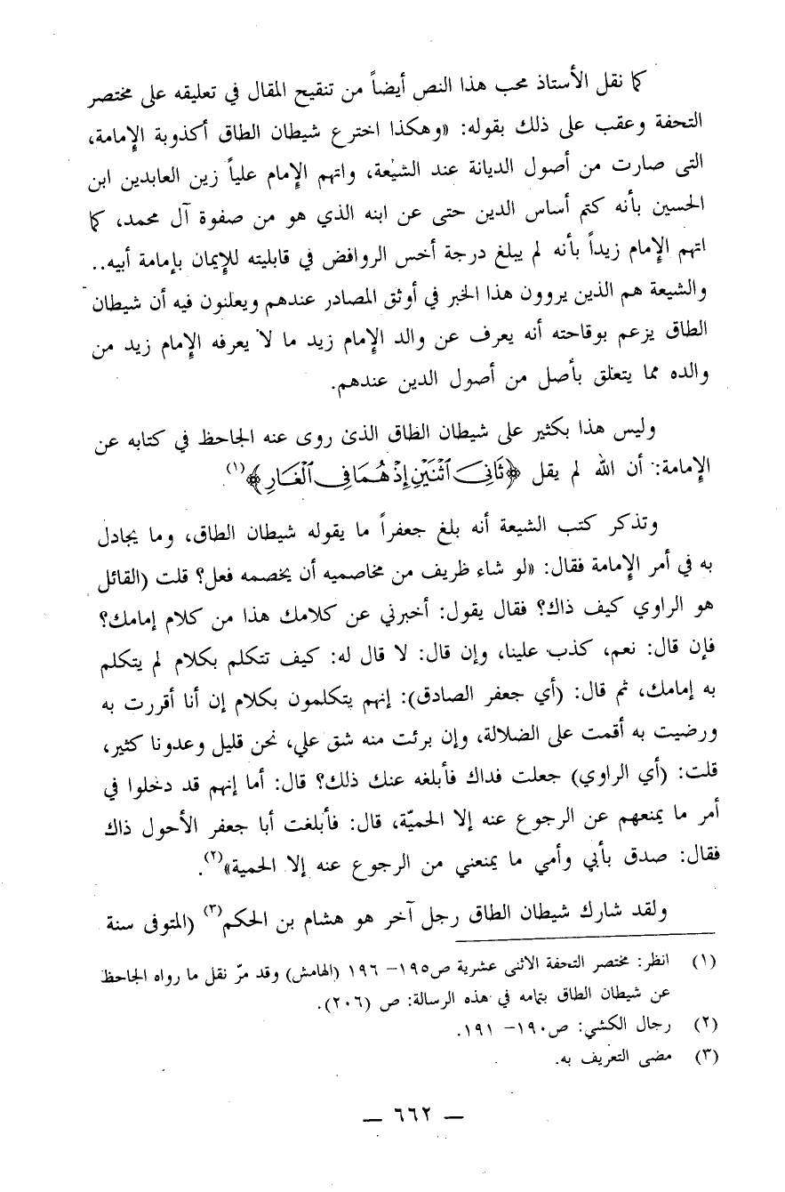 (¬1) انظر: مختصر التحفة الاثني عشرية ص195-196 (الهامش) ، وقد مرّ نقل ما رواه الجاحظ عن شيطان الطاق بتمامه في هذا الكتاب: ص (206)
