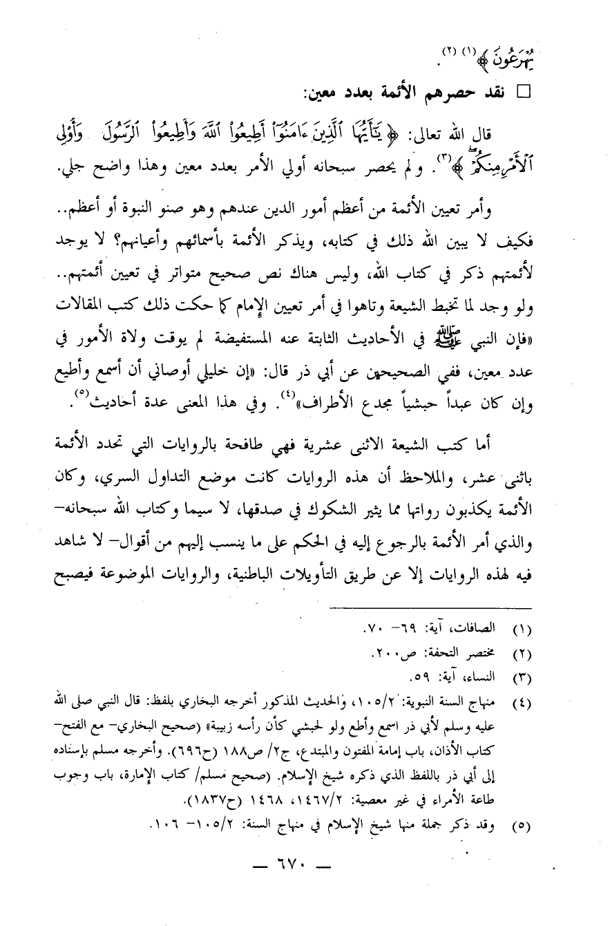 قال الله تعالى: {يَا أَيُّهَا الَّذِينَ آمَنُواْ أَطِيعُواْ اللهَ وَأَطِيعُواْ الرَّسُولَ وَأُوْلِي الأَمْرِ مِنكُمْ} (¬3) . ولم يحصر سبحانه أولي الأمر بعدد معين وهذا واضح جلي.