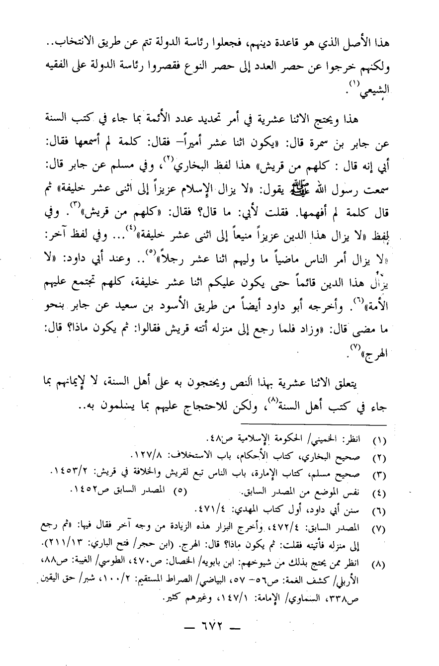 هذا ويحتجّ الاثنا عشريّة في أمر تحدي عدد الأئمّة بما جاء في كتب السّنّة عن جابر بن سمرة قال: "يكون اثنا عشر أميرًا - فقال كلمة لم أسمعها، فقال أبي: إنّه قال: كلّهم من قريش" هذا لفظ البخاري (¬2) ، وفي مسلم عن جابر قال: سمعت رسول الله صلى الله عليه وسلم يقول: "لا يزال الإسلام عزيزًا إلى اثني عشر خليفة" ثم قال كلمة لم أفهمها. فقلت لأبي: ما قال؟ فقال: "كلّهم من قريش" (¬3) . وفي لفظ: "لا يزال هذا الدّين عزيزًا منيعًا إلى اثني عشر خليفة" (¬4) ، وفي لفظ آخر: "لا يزال أمر النّاس ماضيًا ما وليهم اثنا عشر رجلاً" (¬5) . وعند أبي داود: "لا يزال هذا الدّين قائمًا حتى يكون عليكم اثنا عشر خليفة، كلّهم تجتمع عليهم الأمّة" (¬6) . وأخرجه أبو داود أيضًا من طريق الأسود بن سعيد عن جابر بنحو ما مضى قال: "وزاد فلما رجع إلى منزله أتته قريش فقالوا: ثم يكون ماذا؟ قال: الهرج" (¬7) .