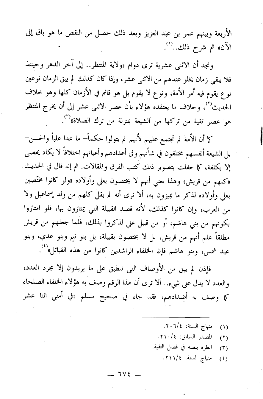 ونجد أن الاثني عشرية ترى دوام "ولاية المنتظر.. إلى آخر الدهر، وحينئذ فلا يبقى زمان يخلو عندهم من الاثني عشر، وإذا كان كذلك لم يبق الزمان نوعين: نوع يقوم فيه أمر الأمة، ونوع لا يقوم بل هو قائم في الأزمان كلها وهو خلاف الحديث (¬2) ، وخلاف ما يعتقده هؤلاء بأن عصر الاثني عشر إلى أن يخرج المنتظر هو عصر تقية من تركها من الشيعة بمنزلة من ترك الصلاة" (¬3) .
